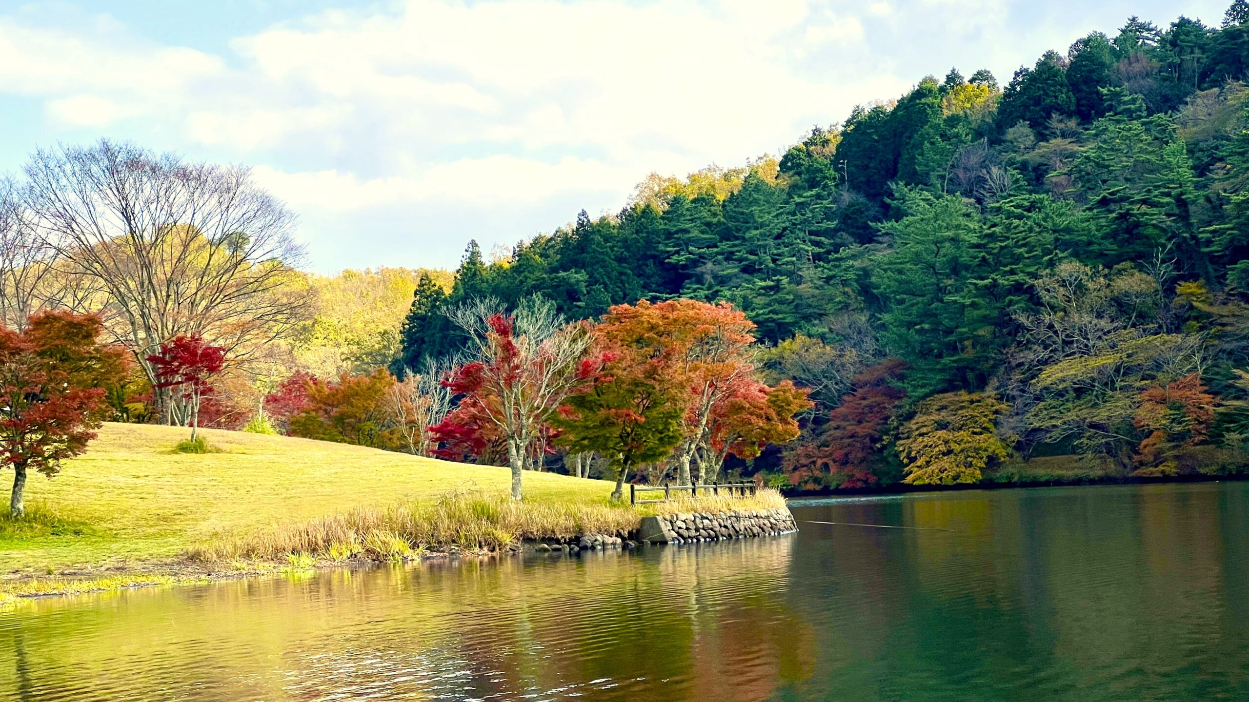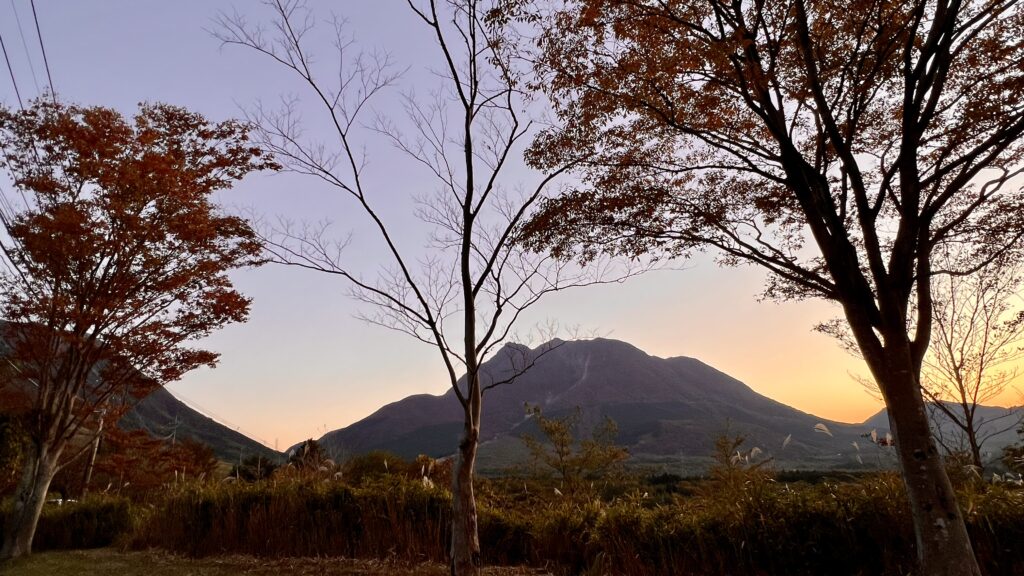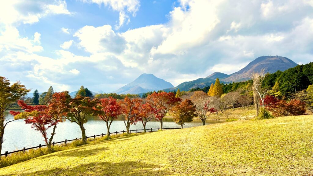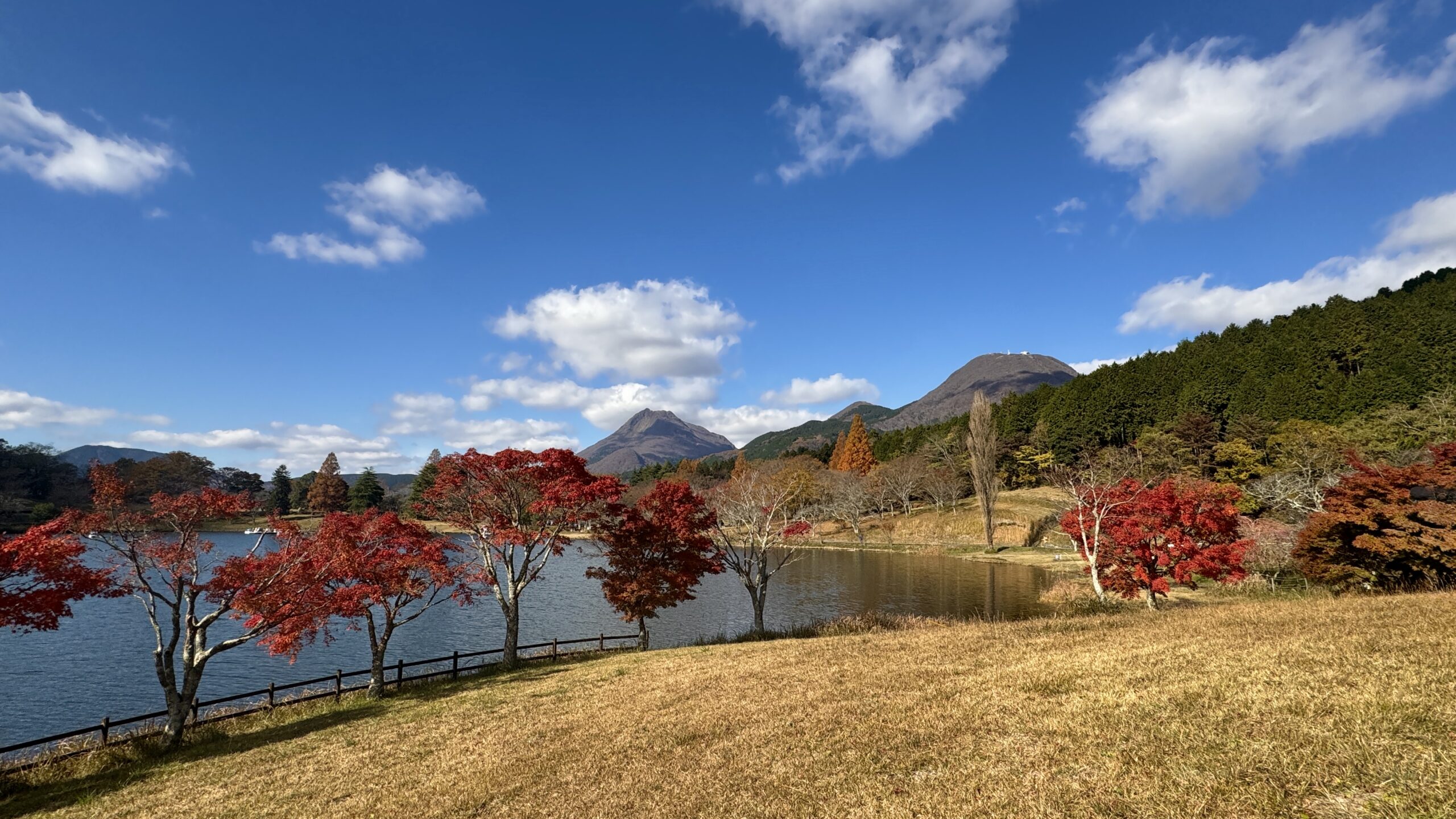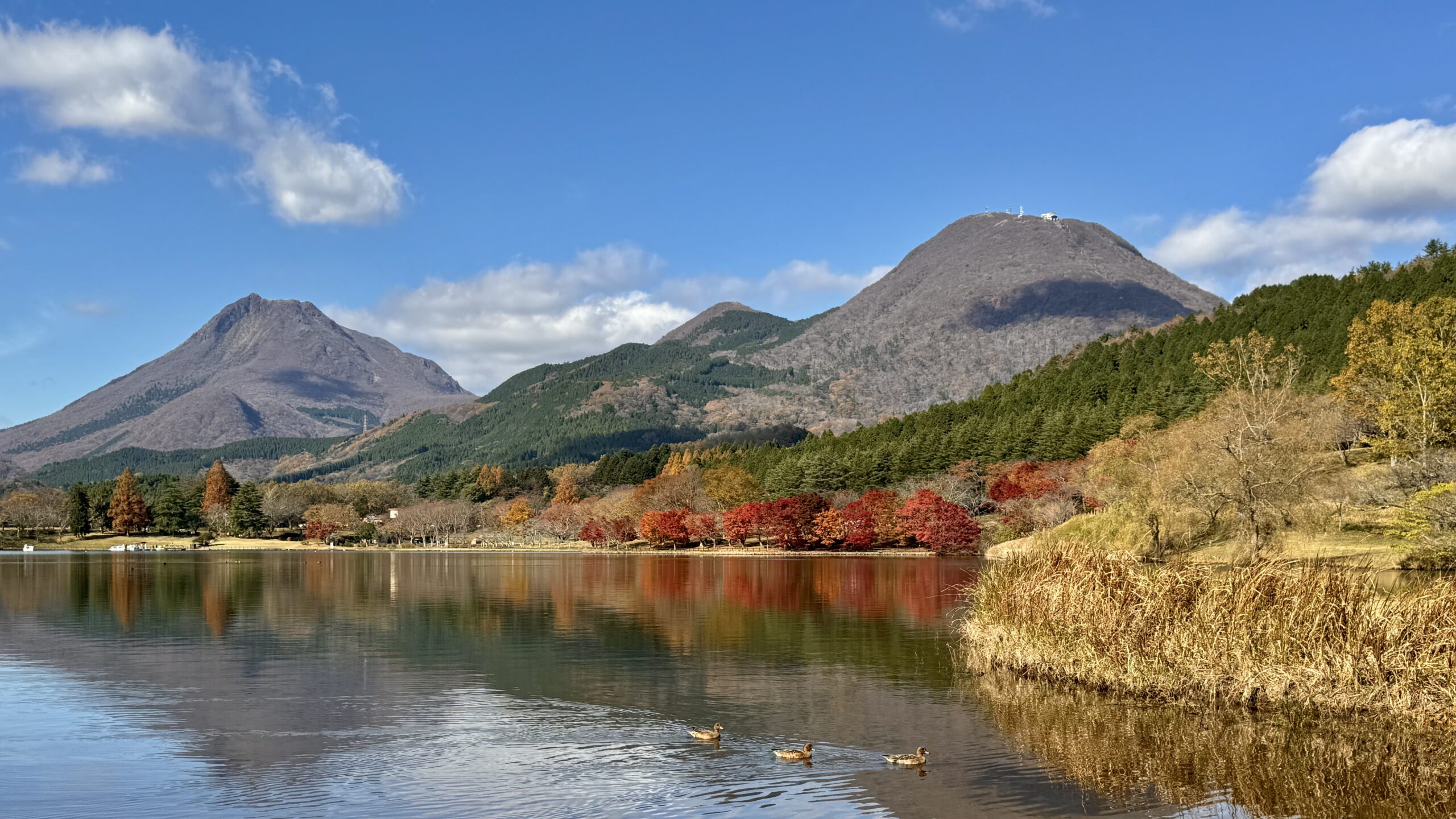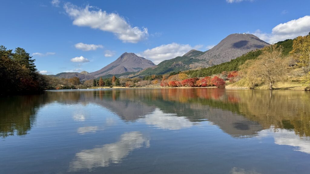 紅葉の湖のほとりを散歩しながら由布山と鶴見山を同時に眺める。