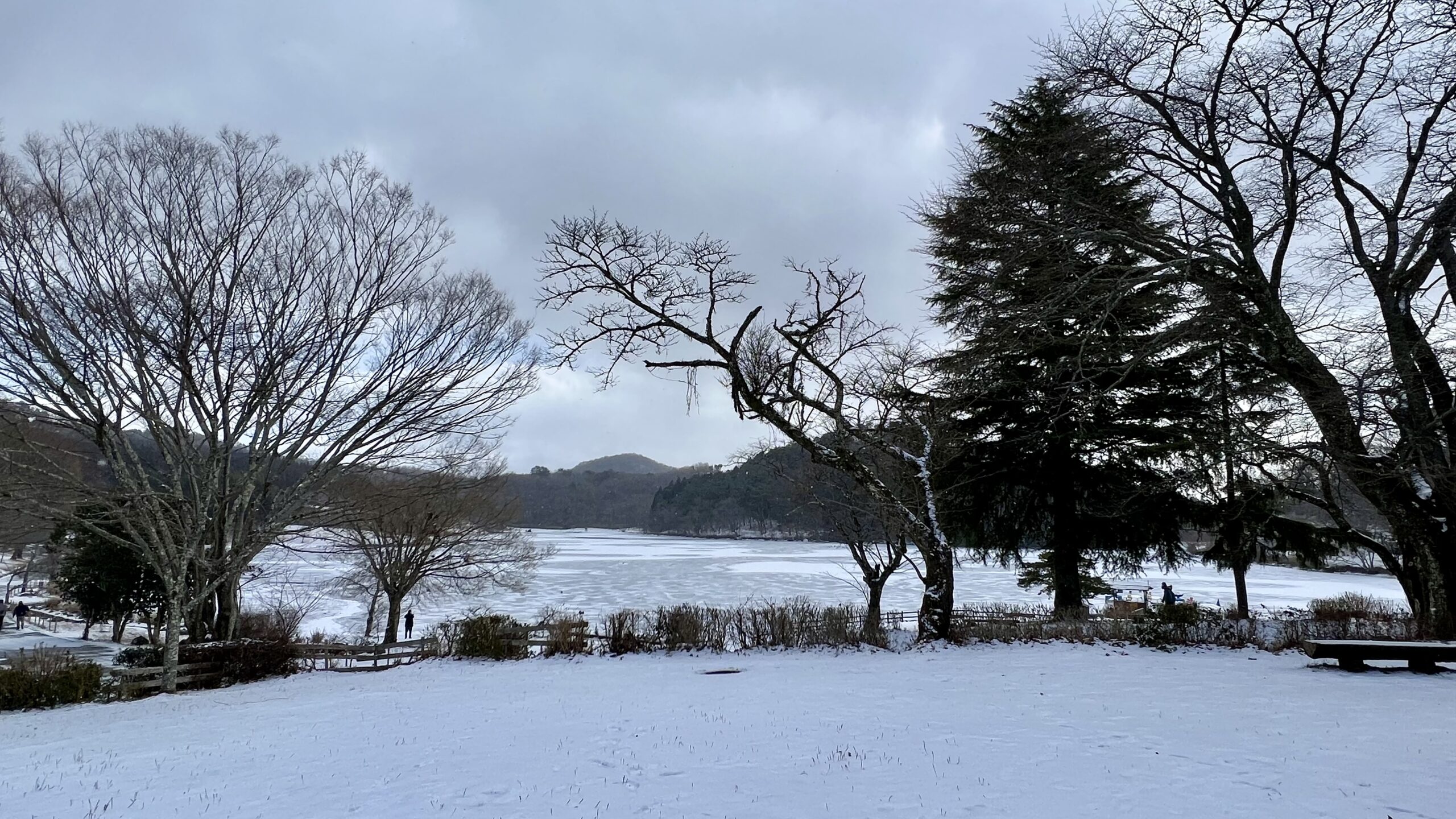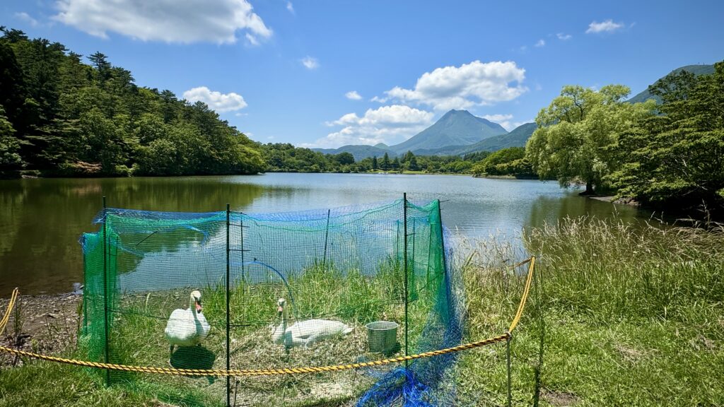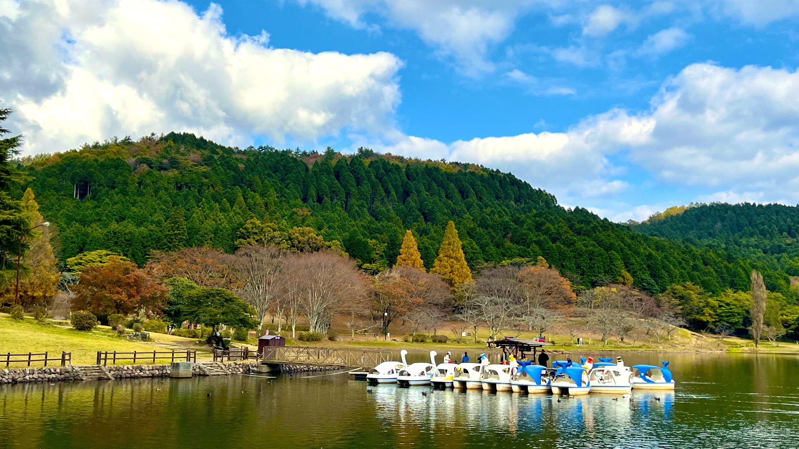 別府から車で15分ほどの高原にある市民憩いの湖。おなじみボートもあり家族で漕いで楽しめる。