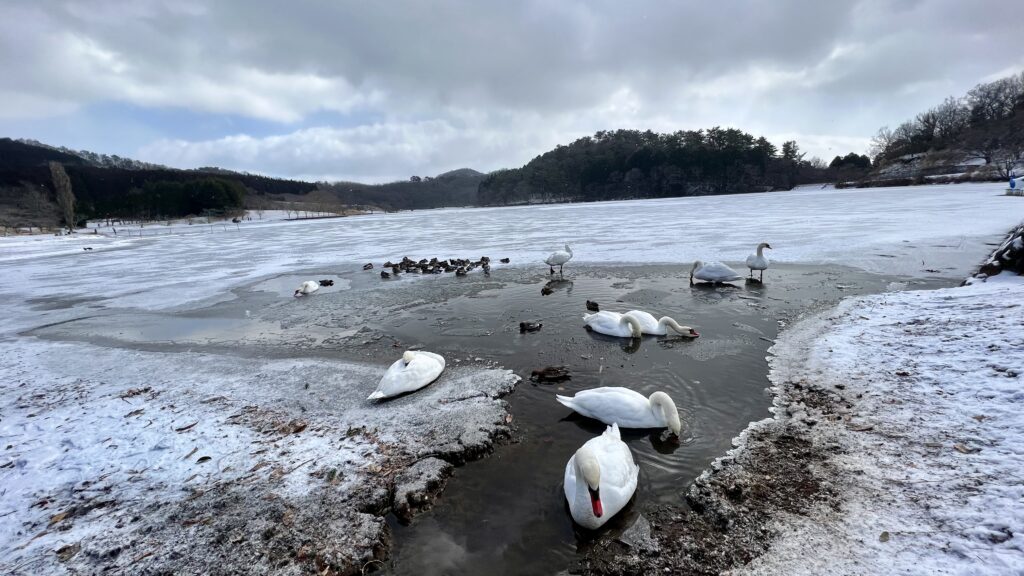 この冬は数年ぶりに氷が張った。氷の割れ目に餌を求めて白鳥が集まってくる。