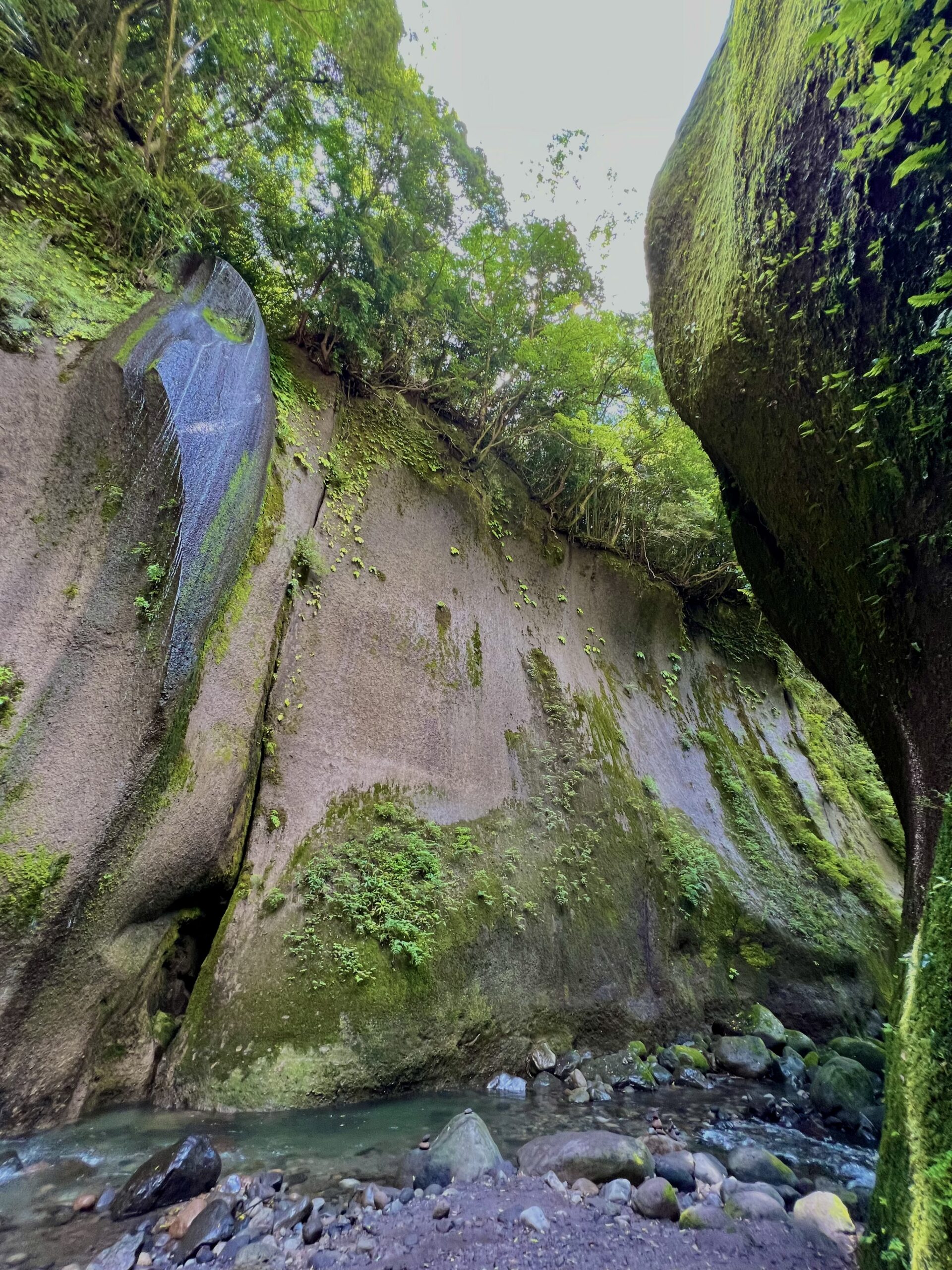 小柳の滝、すだれの滝をすぎて由布川の渓流を下っていくと霊気漂う別世界。神秘の景観が楽しめる。