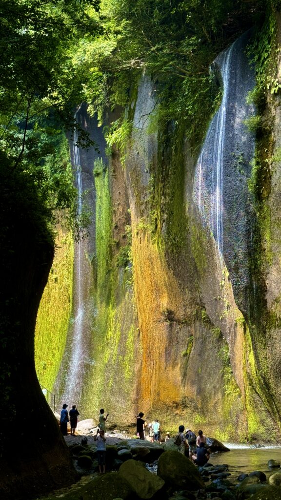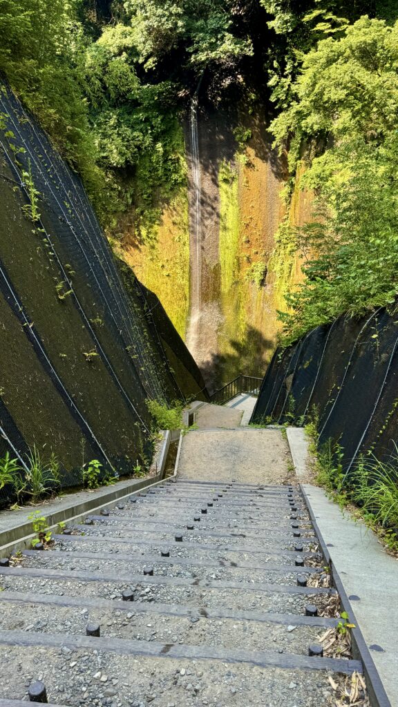 新猿渡入口の駐車場から200段余りの階段を下るといきなり白い糸の様に流れおちる滝に出くわす。