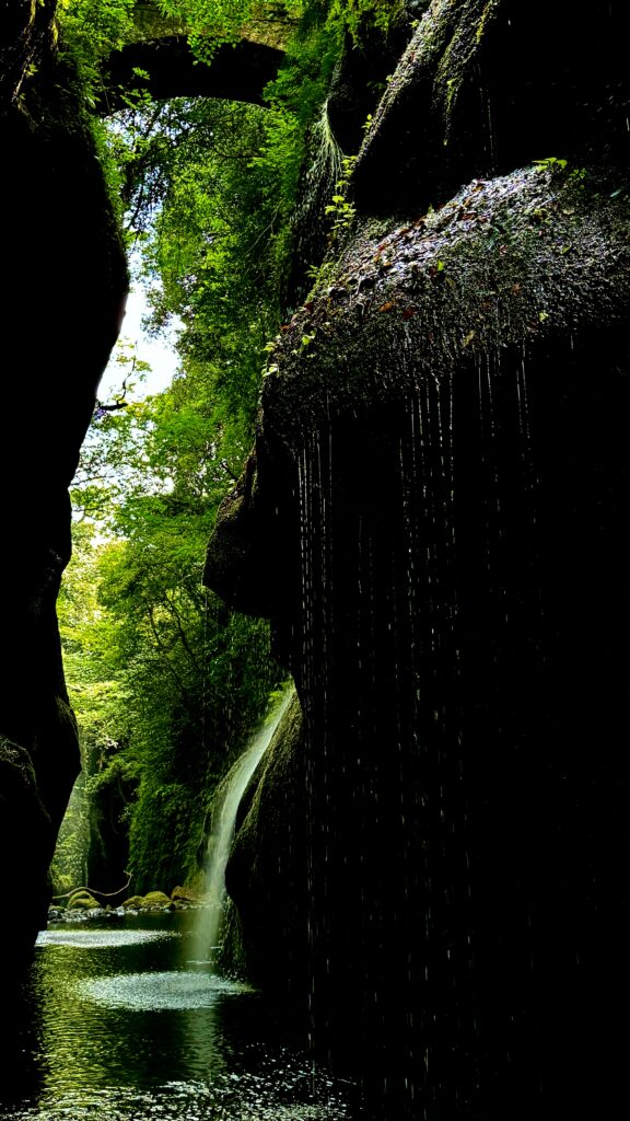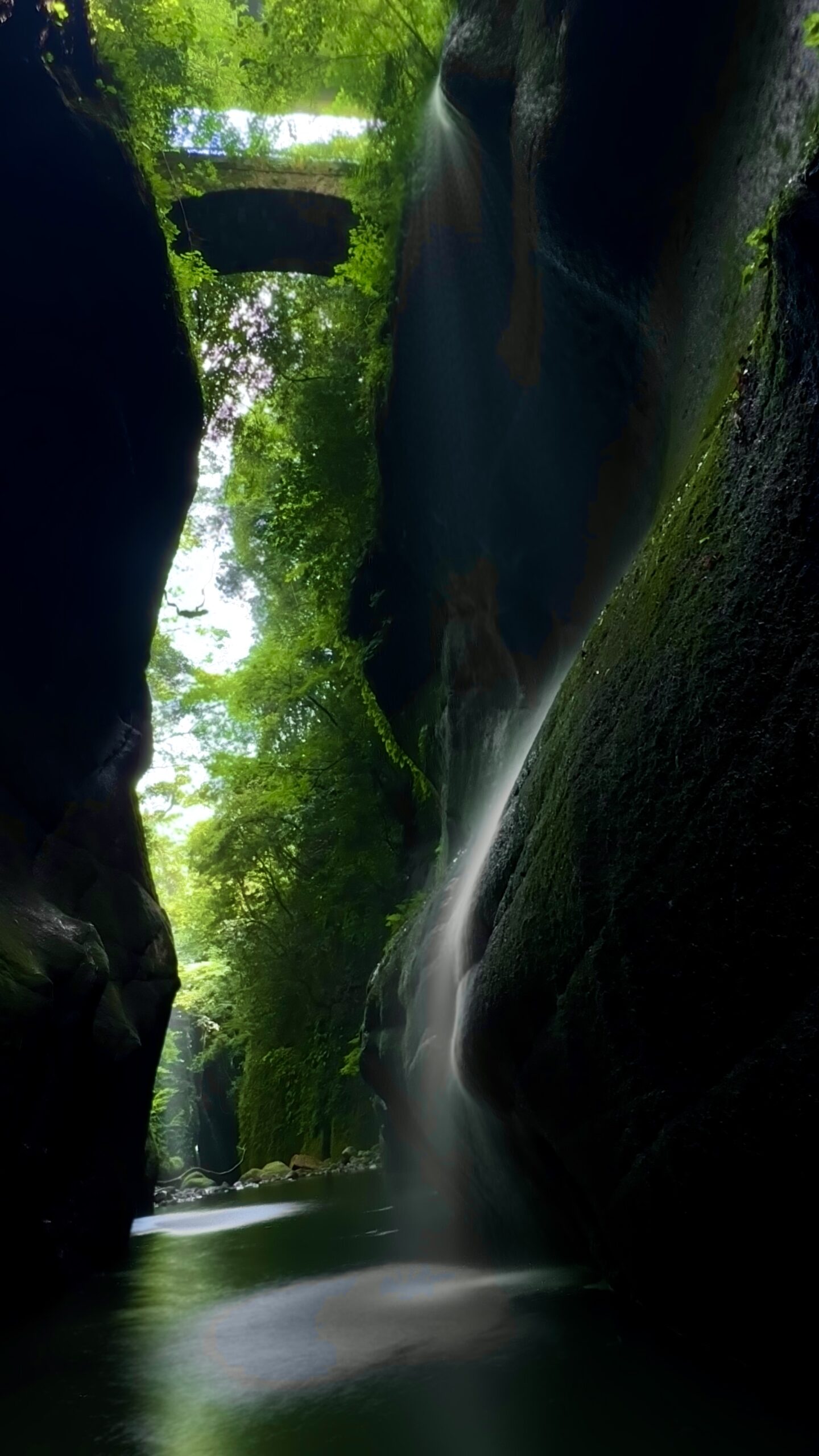 東洋のチロルと呼ばれる由布川峡谷は、由布岳と鶴見岳の間を流れる由布川の景勝地で、深さ60mの断崖が垂直に切り立ち、約12Kmにわたって続く。岩肌を糸の様にすべる40数条の滝、大小100余りの濃紺の深淵など自然が織りなす神秘の峡谷です。