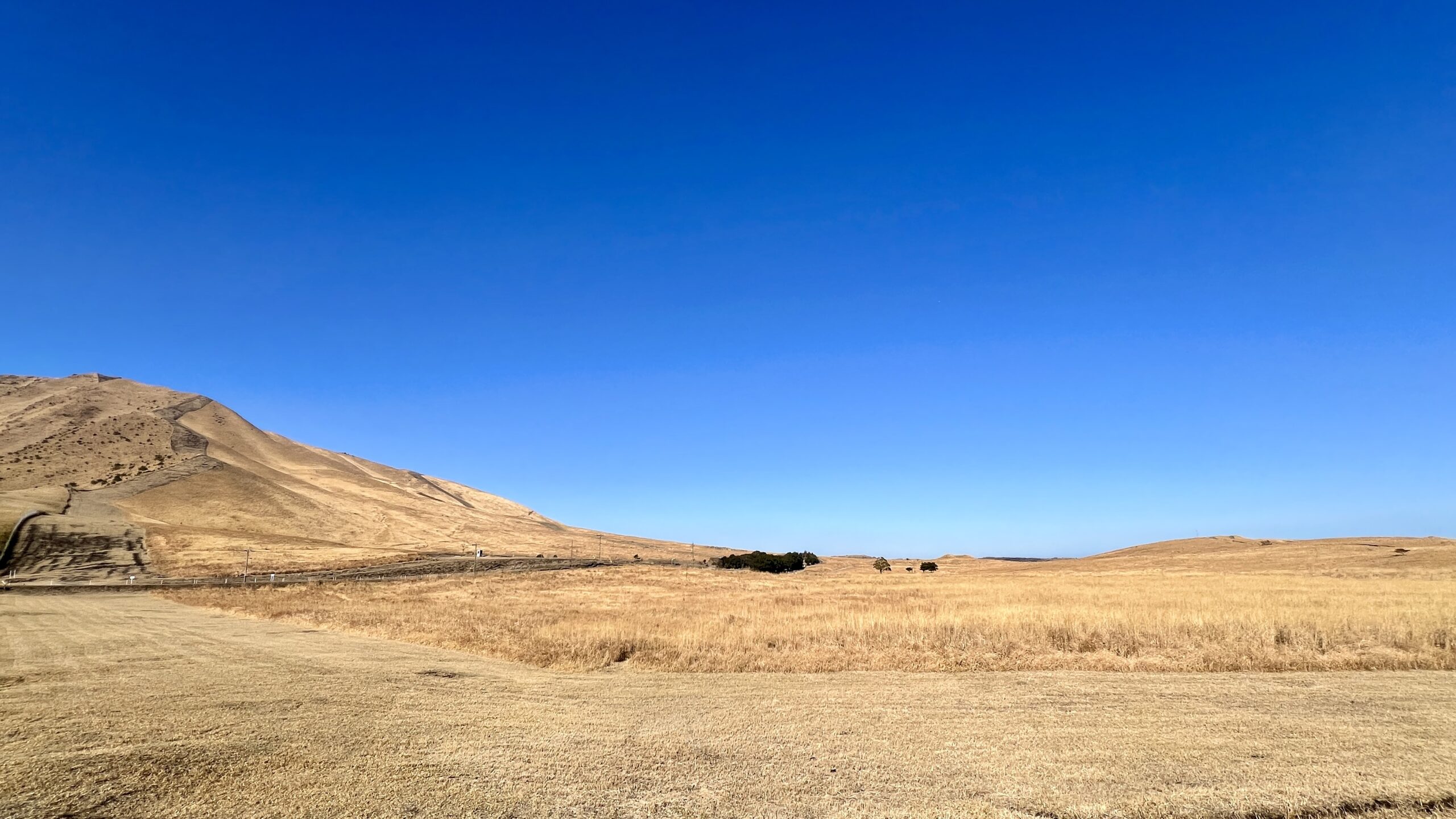 冬の平原。青と黄朽葉色のコントラストがきれい。