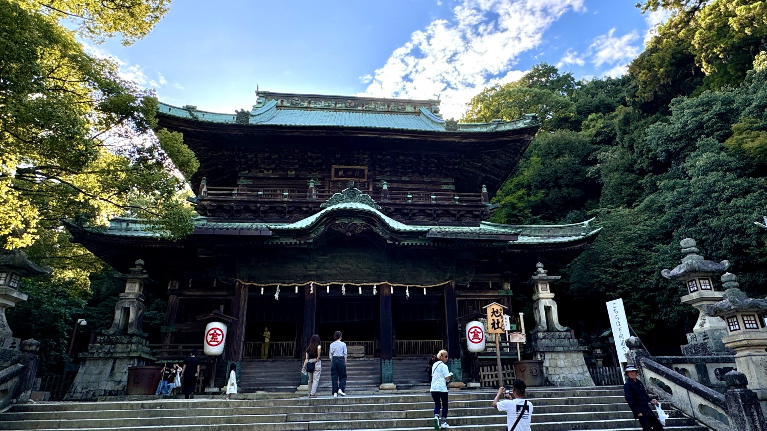 旭社 (628段) 重要文化財に指定され、二層入母屋造りの社殿には随所に精巧な彫刻が施されている。