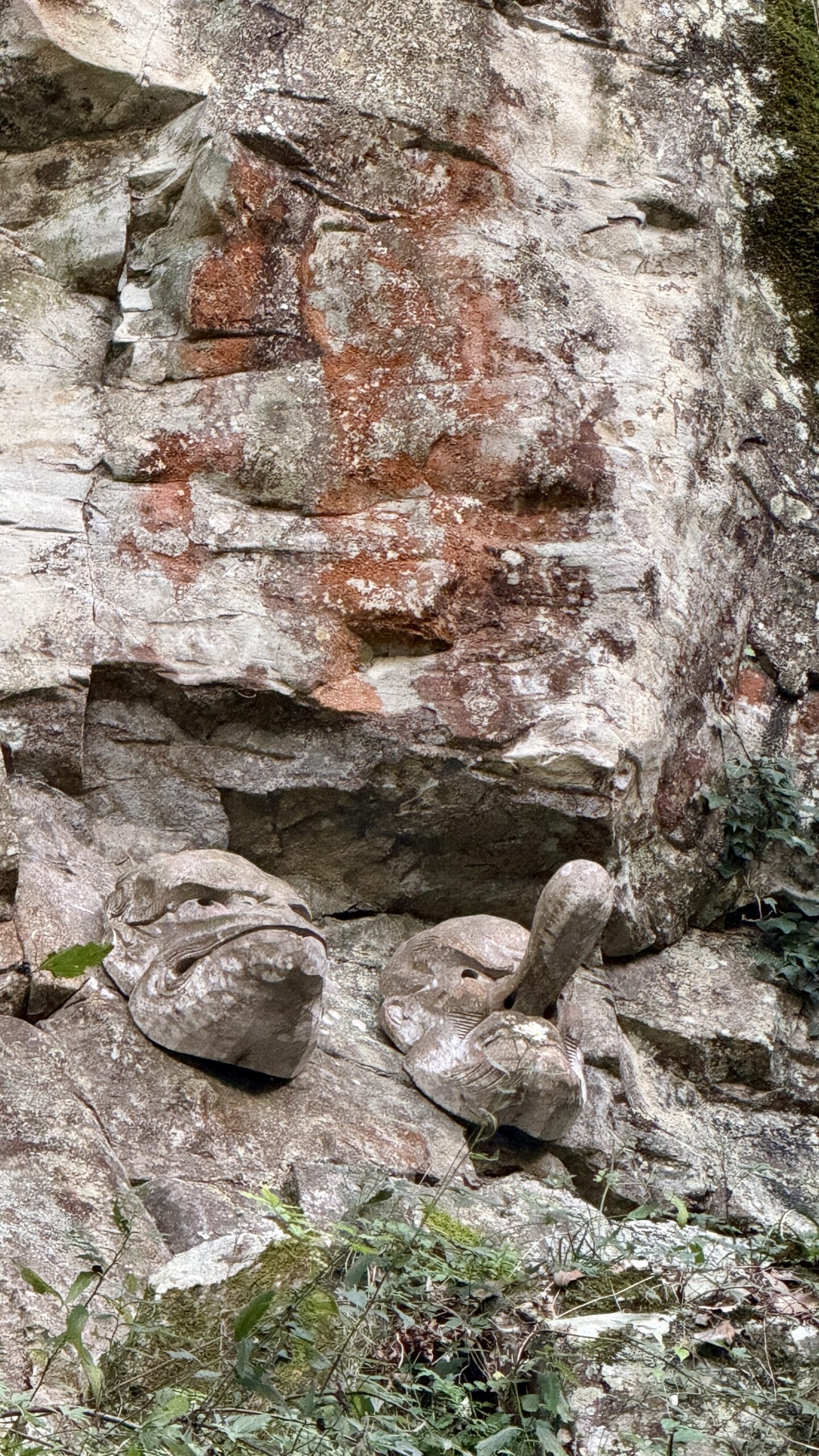 奥社の岩壁には天狗のお面が掛かっている。