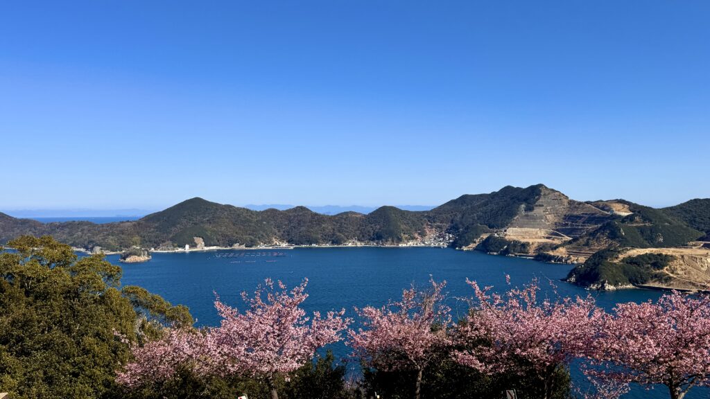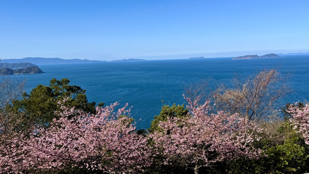 四浦展望台から河津桜を通して佐賀関~佐伯までのリアス式海岸のパノラマは絶景である