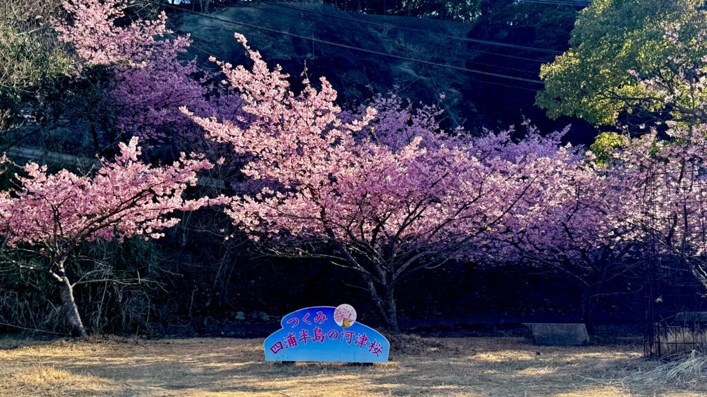 四浦半島の海岸沿道は、2月~3月にかけて、5000本を超える河津桜で鮮やかなピンクに染まる。