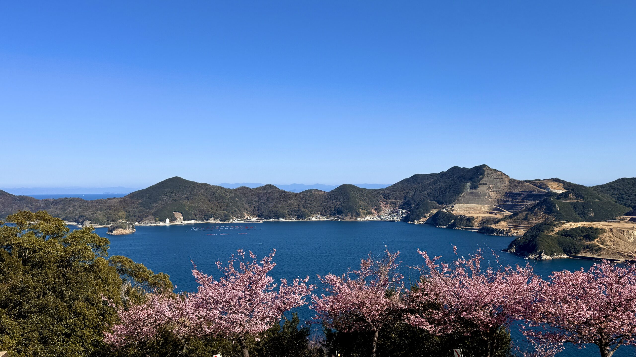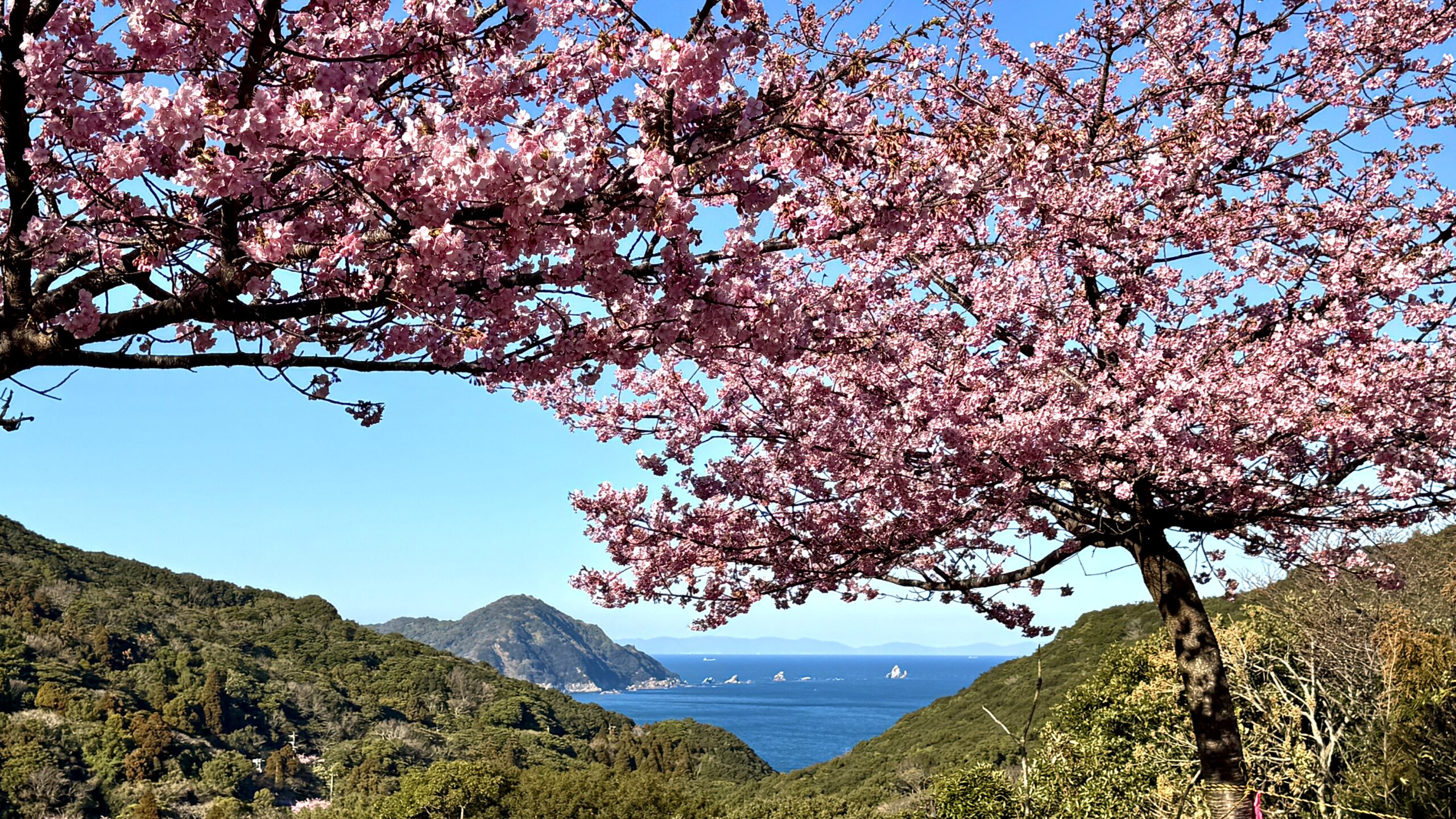 四浦半島の海岸沿道は、2月~3月にかけて、5000本を超える河津桜で鮮やかなピンクに染まる。