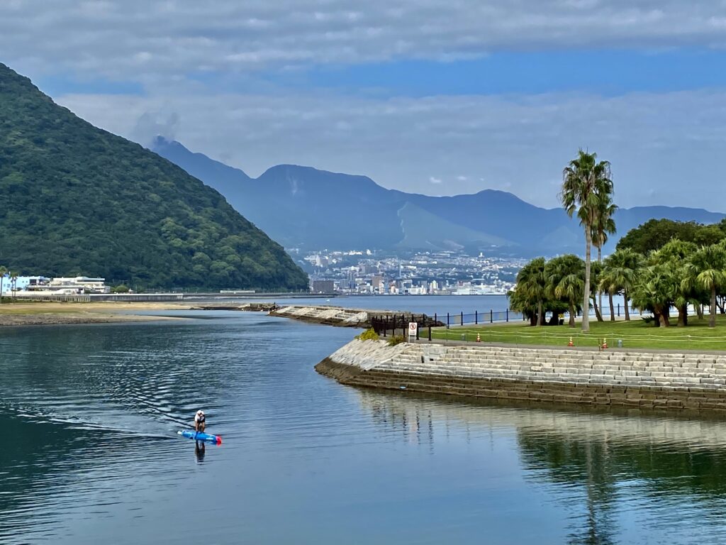 パドリングは楽しそう。向こうには別府の全景が見える。