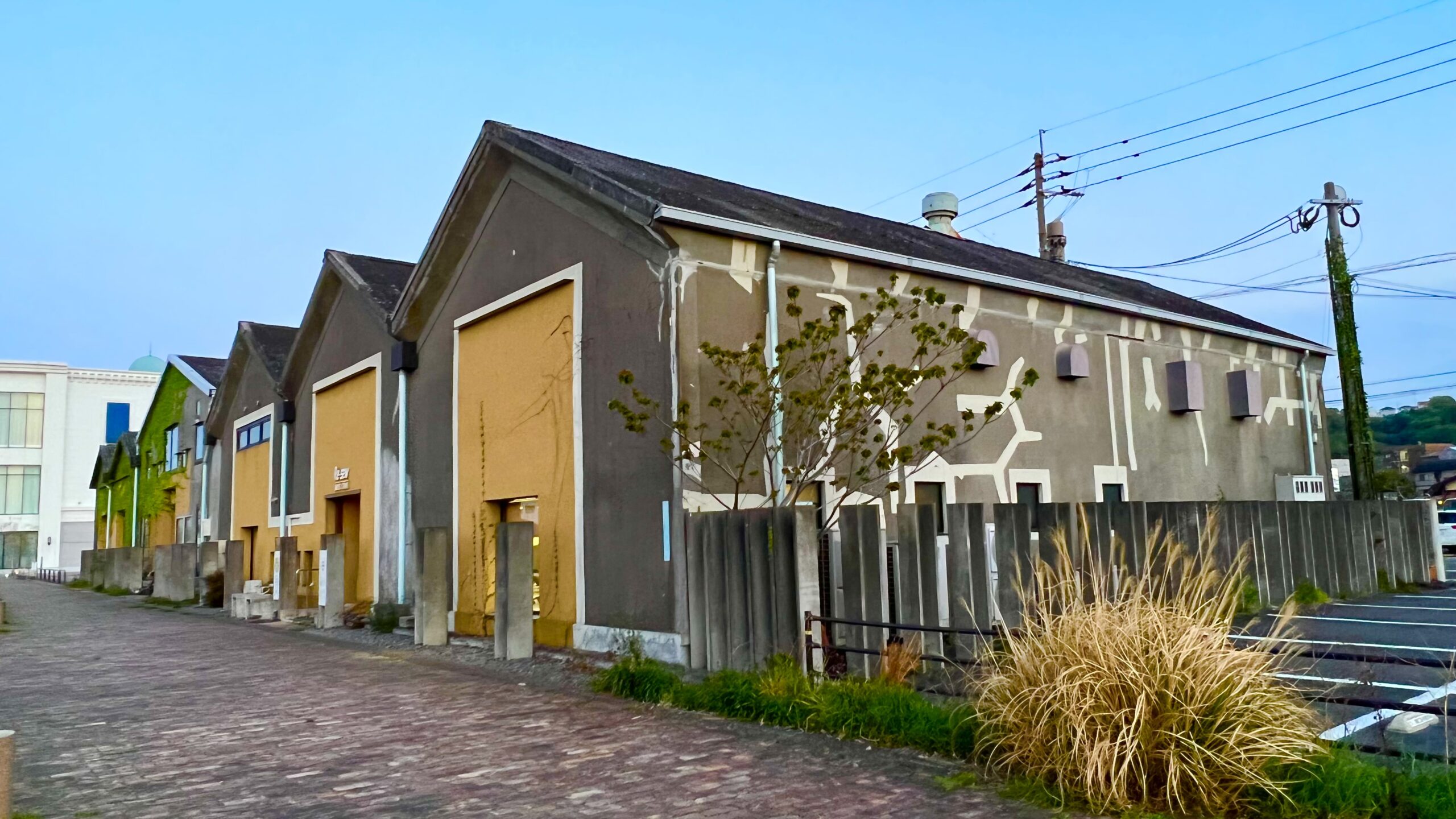 かんたん港のレンガ倉庫。遠くに夕焼けに染まる鶴見山が見えます。