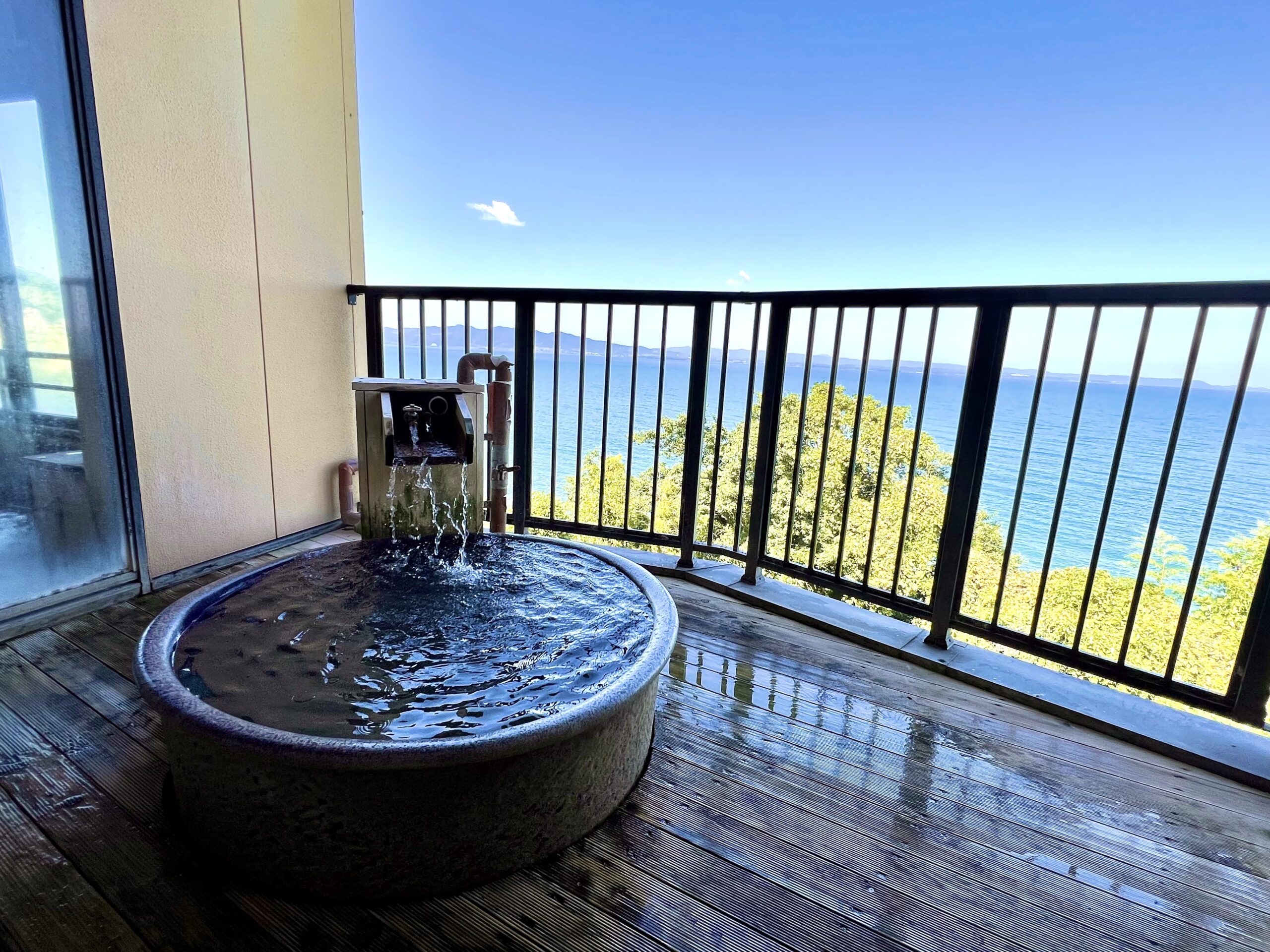 露天風呂は眼下に海があり爽快な気分で湯につかれる。