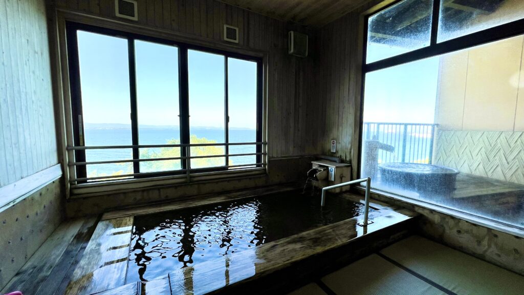 家族風呂の「日和」 内風呂は広く露天風呂もありどちらも別府湾を一望できる。