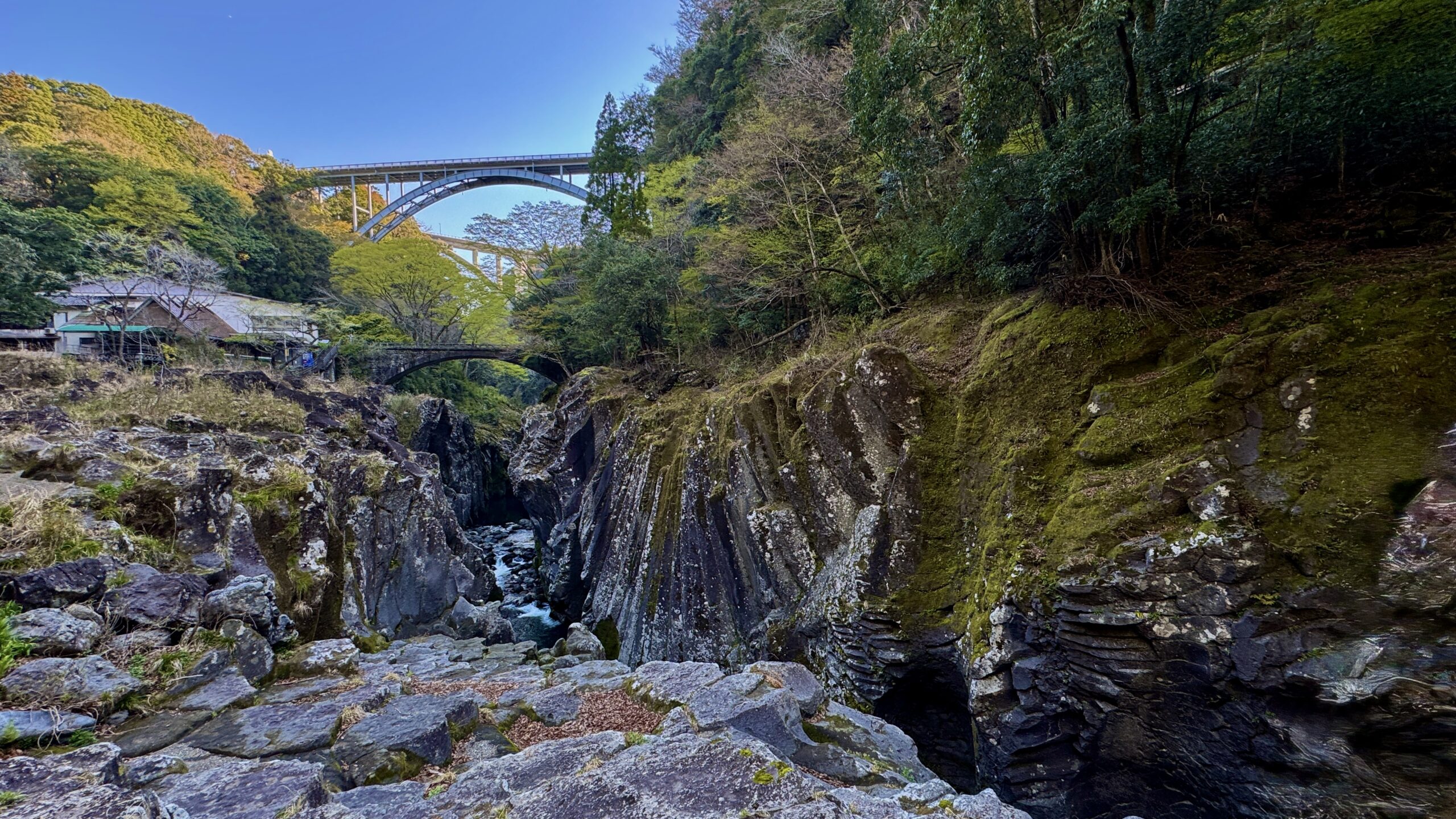 高千穂三段橋は峡谷に3本の橋が架かっていて、下から順に 神橋 (石橋) 、高千穂大橋 (鋼橋)、神都高千穂大橋 (コンクリート橋) 。一度に3本を眺めることが出来るので全国的にも珍しい観光スポット。