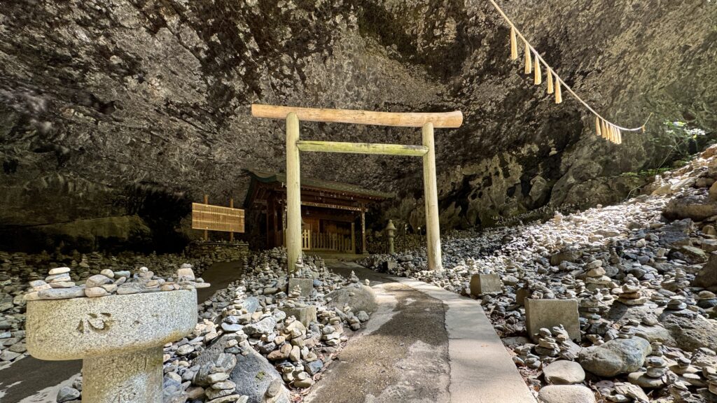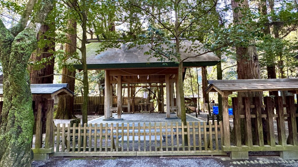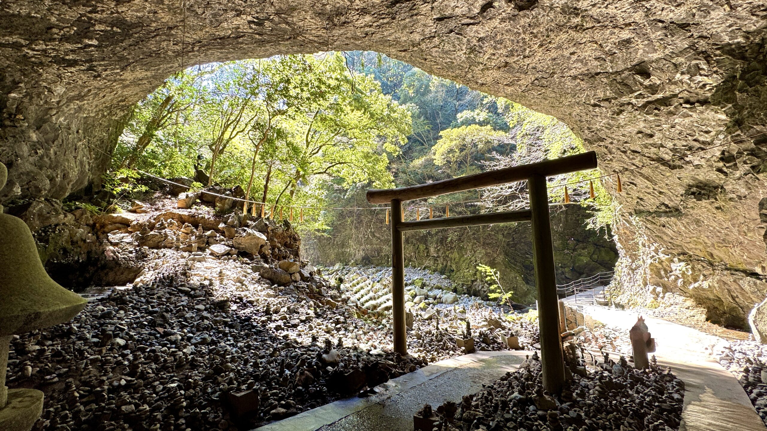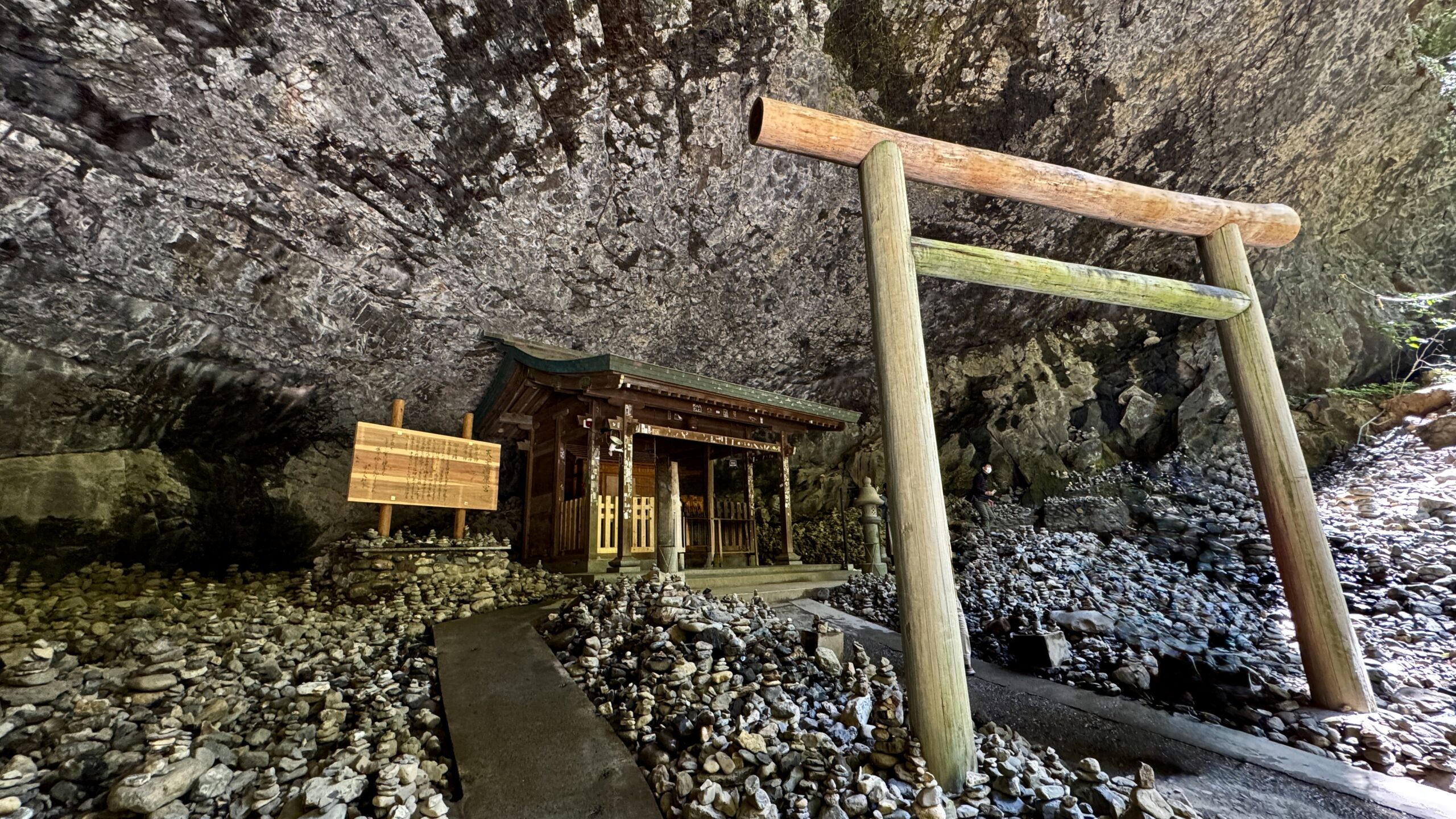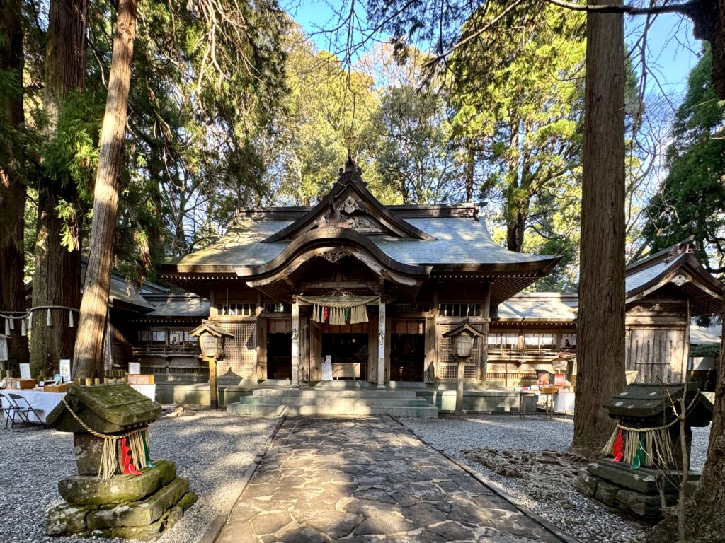 左手に二本の杉の幹が結ばれ一つになった「夫婦杉(めおとすぎ)」があり、この夫婦杉の周りを大好きな人と手をつないで3回廻ると幸せになるといわれています。