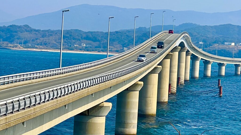 エメラルドグリーンに輝く海の上に浮かぶように架けられている橋は、オーシャンビューの絶景を楽しめるドライブルートとして大人気。