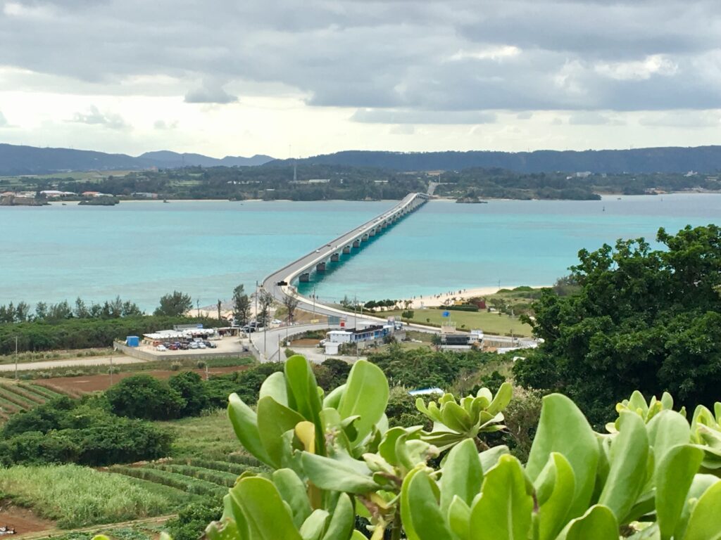 古宇利島へつながる古宇利大橋は約2kmあり視界いっぱいのエメラルドグリーンの上を飛んでいるような気持になり最高の景色を楽しめる。