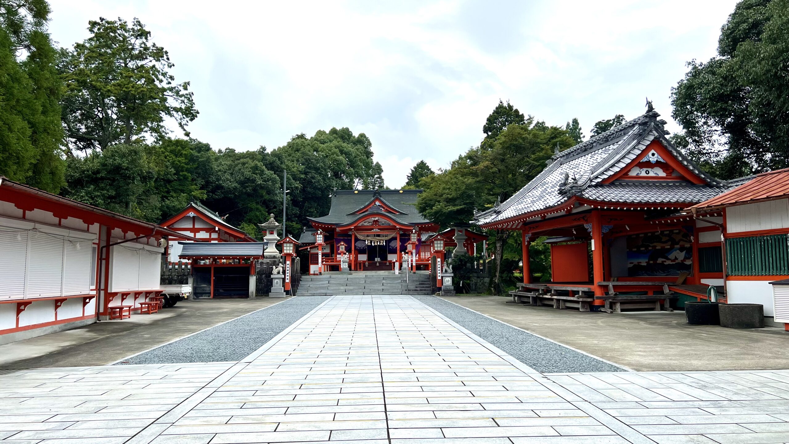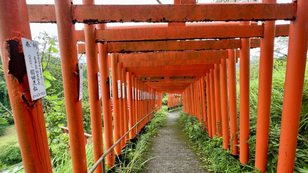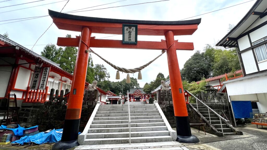 九州三大稲荷神社で商売繁盛・家内安全・学業成就の神様。大分県一の高さを誇る 17m の赤い大鳥居が目立つ。