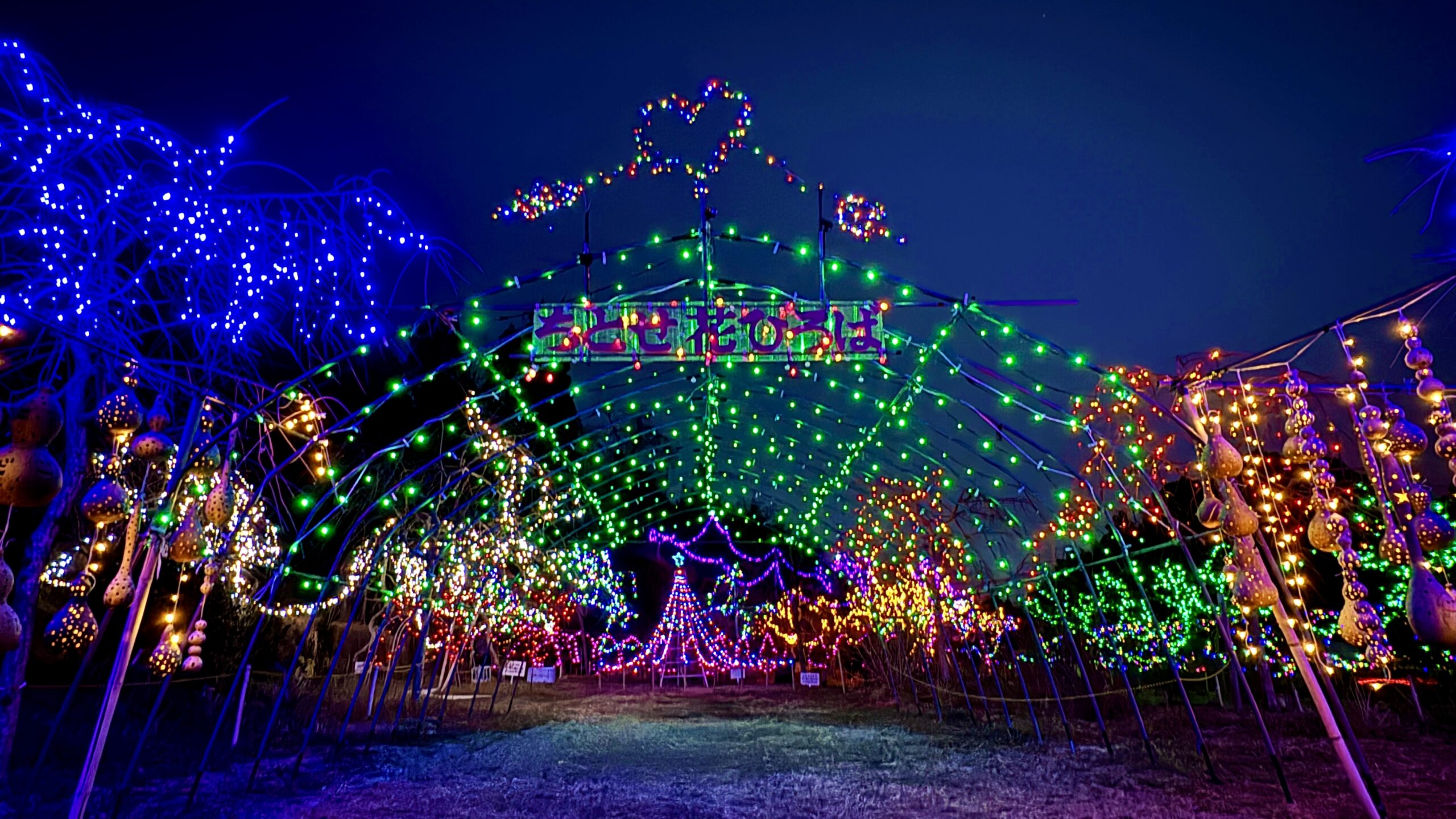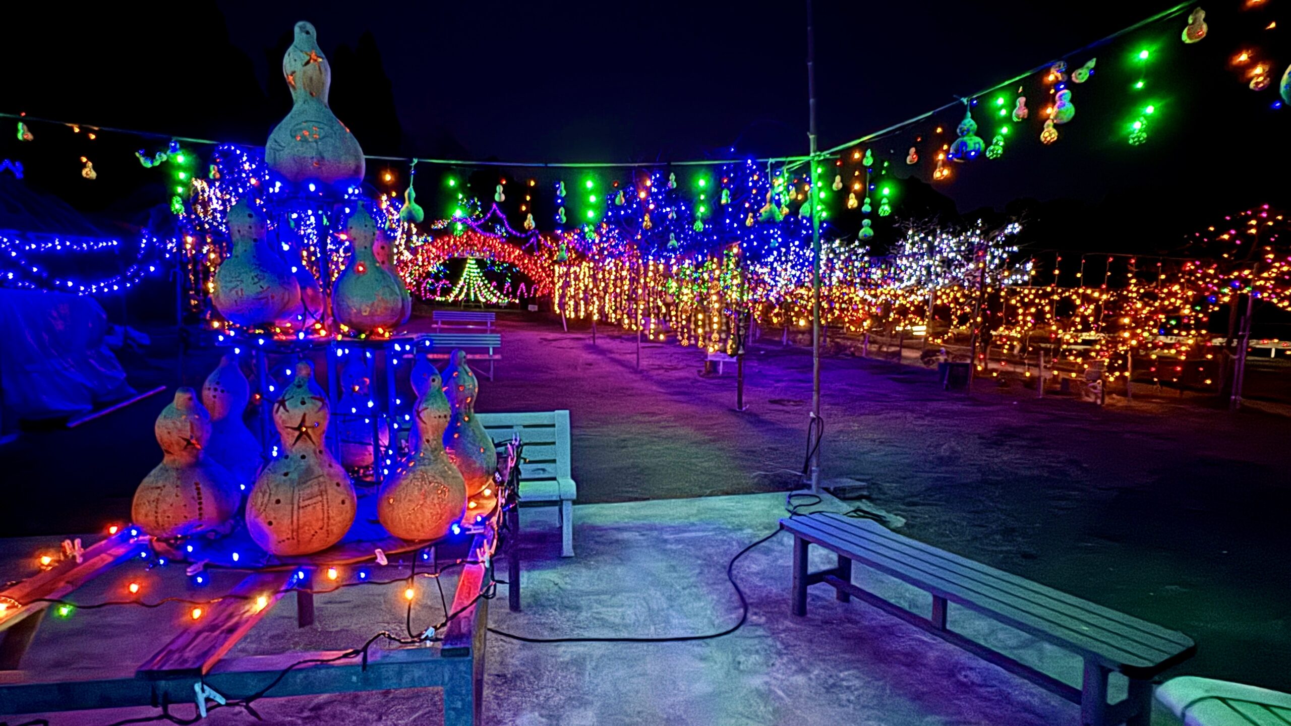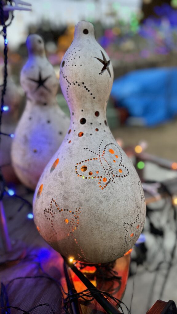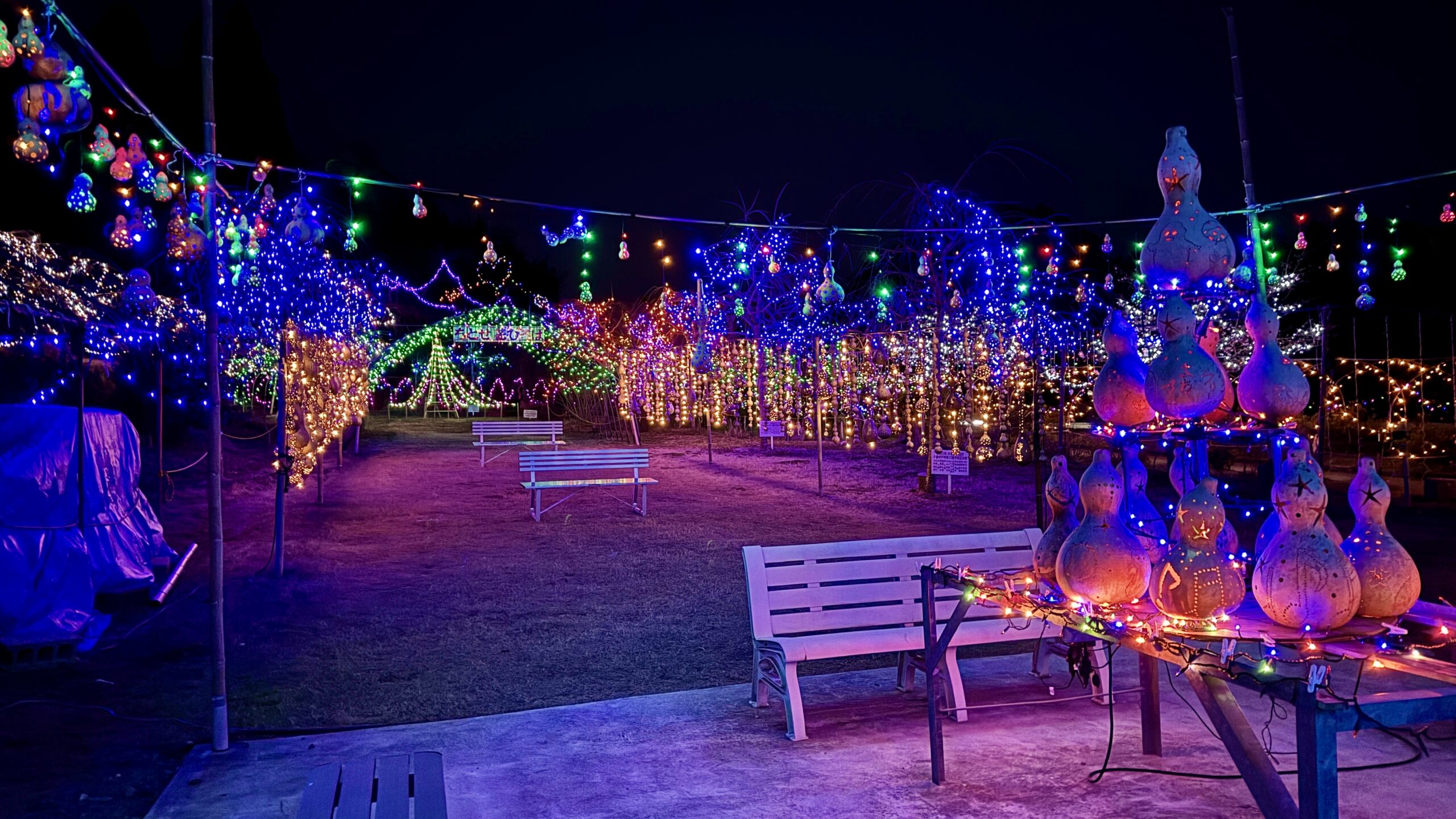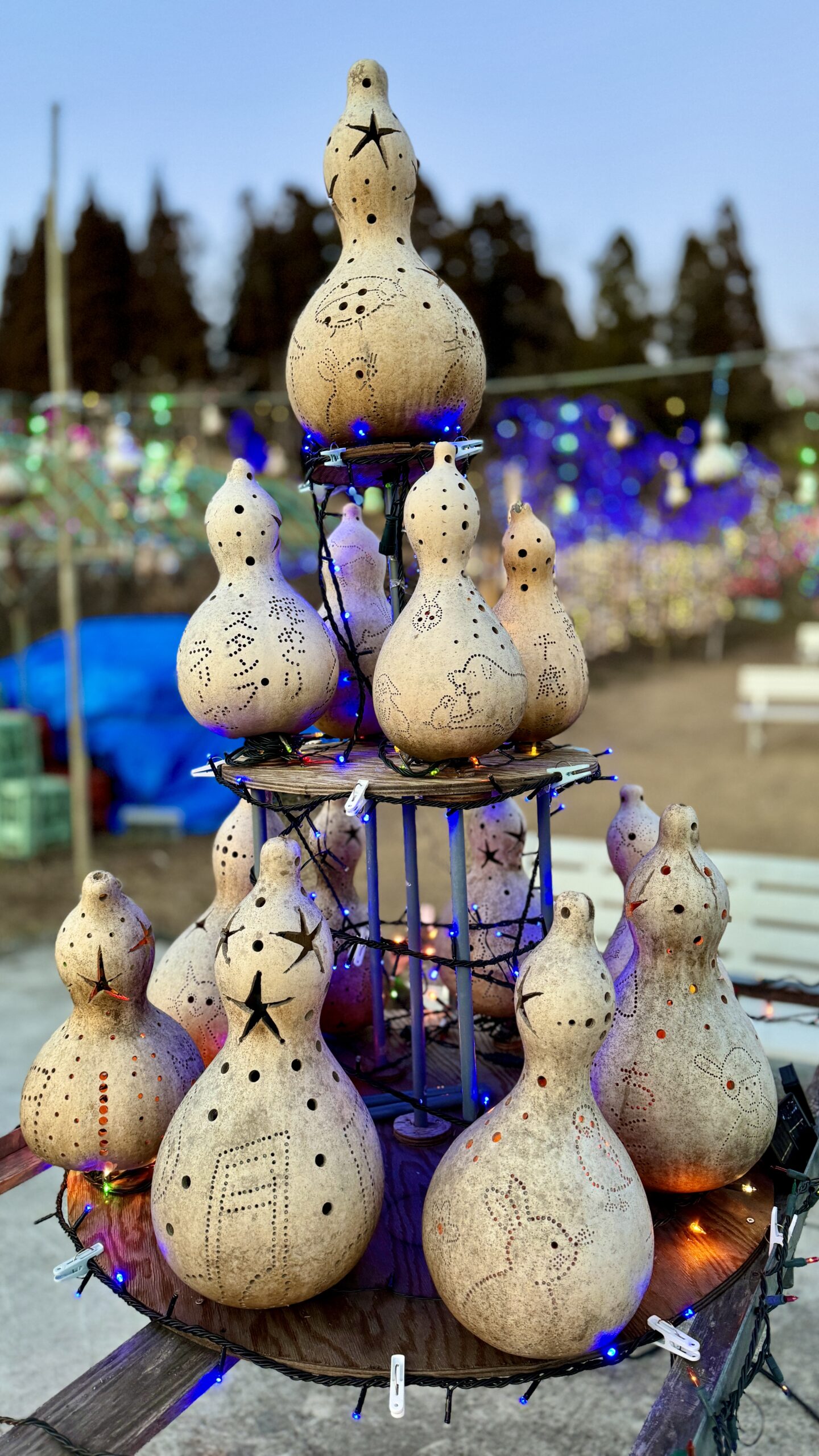 夕方には瓢箪の中に色取りどりの灯りが灯され絵柄も映えてくる。