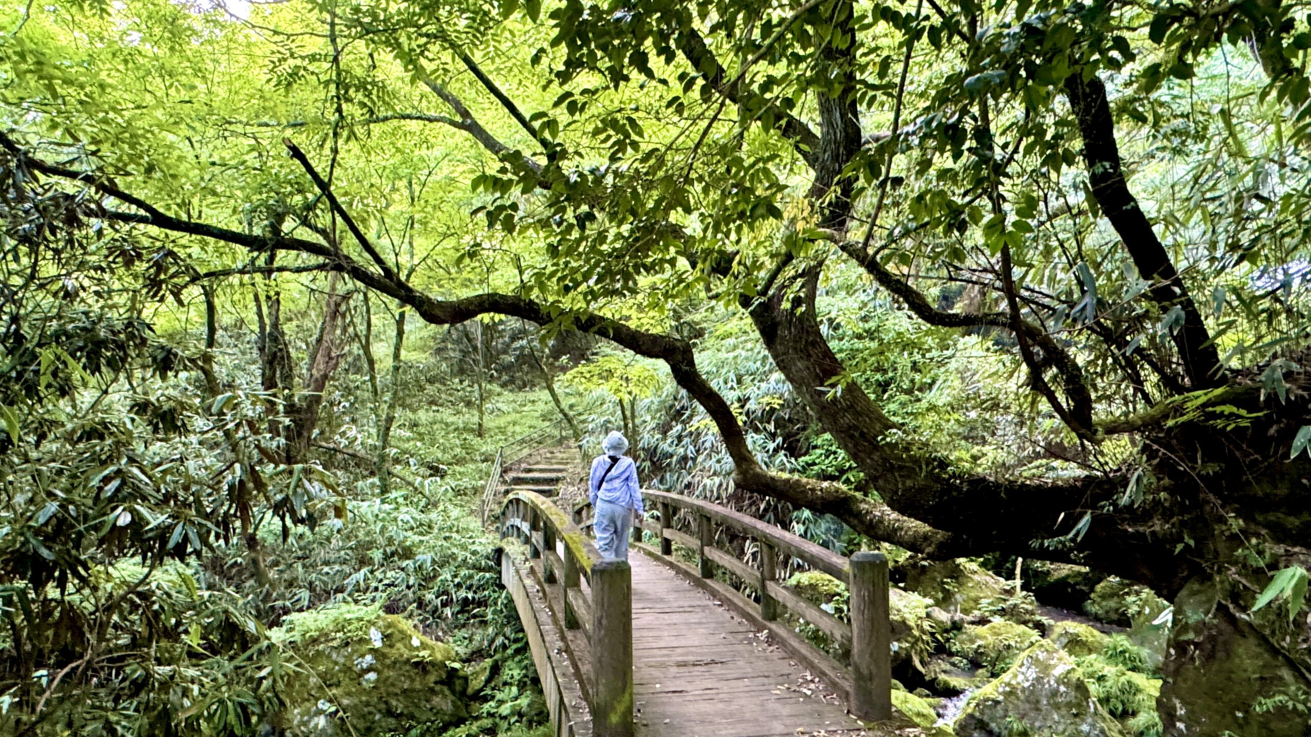遊歩道には木で作られた歩道橋や大きなつり橋がある。