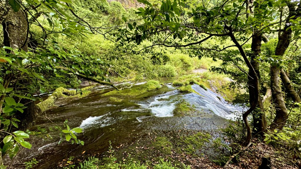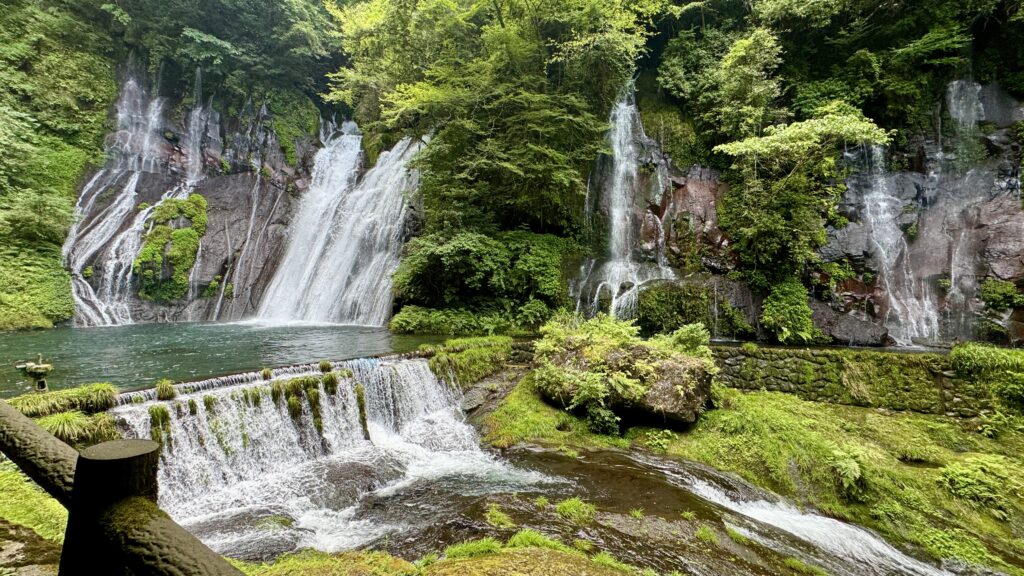 駐車場から森の中の遊歩道を歩き始めると所々に岩肌から流れ出る湧水があり、さらに奥に進むと、38mの高さの岩間から流れ落ちる “白水の滝” がある。いくつもの滝がならび、見るのも爽快、かつ、そこからほとばしる湧水のしぶきが あたり一面を真夏でも涼しくしてくれる。