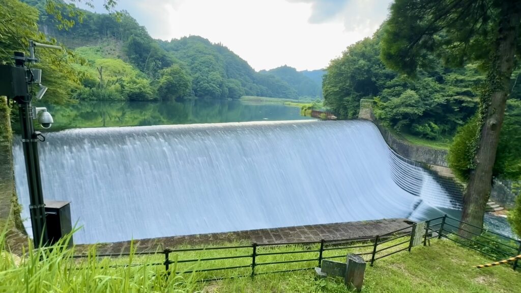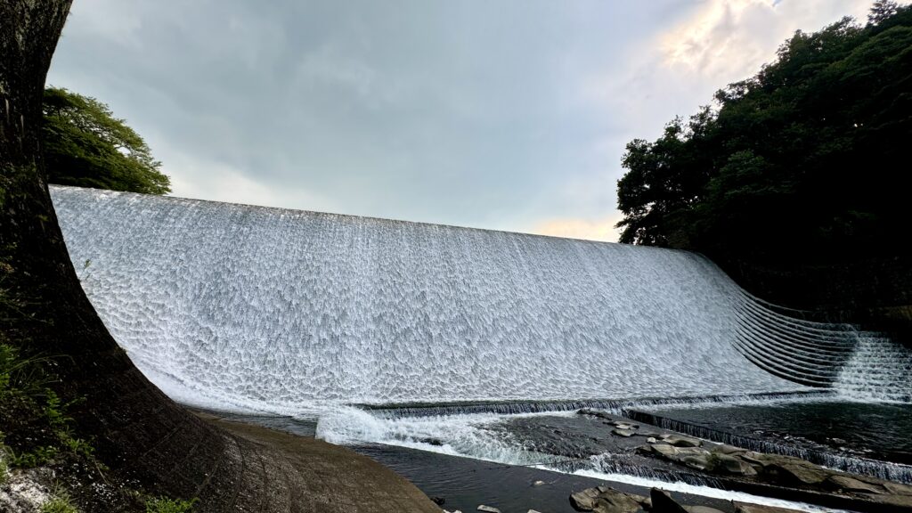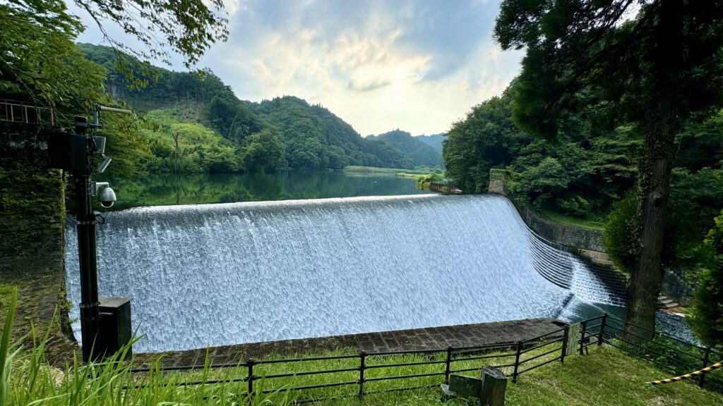 緩やかな斜面に水がゆっくり白い布の様に美しく流れ落ちるダム。堤長87m、高さ14mの巨大なベールが流れる姿は日本一美しいダムと言われ、国の重要文化財に指定されている。