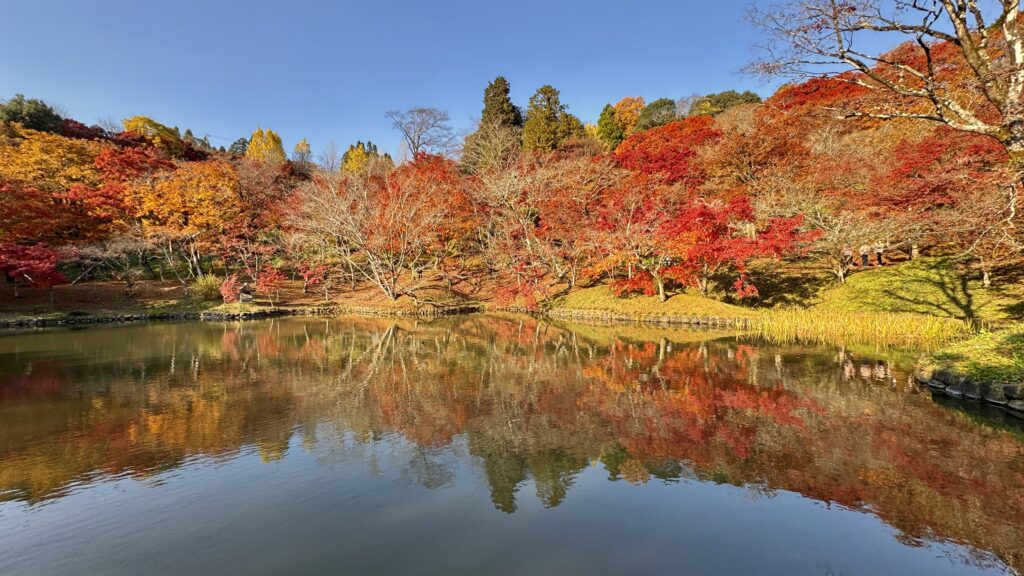 心字池に綺麗に映る紅葉。そこに繫がる小さな橋も魅せられる。