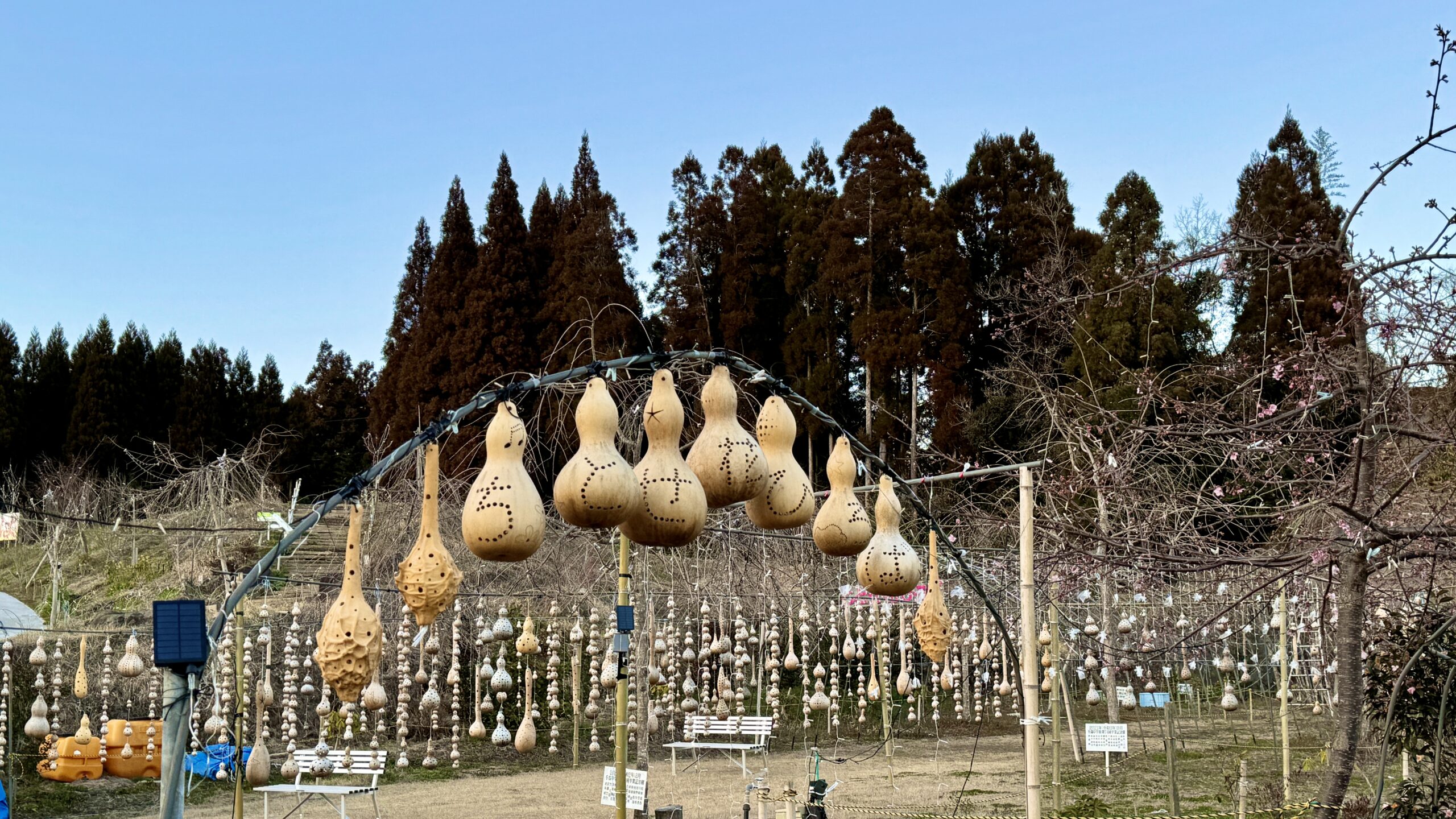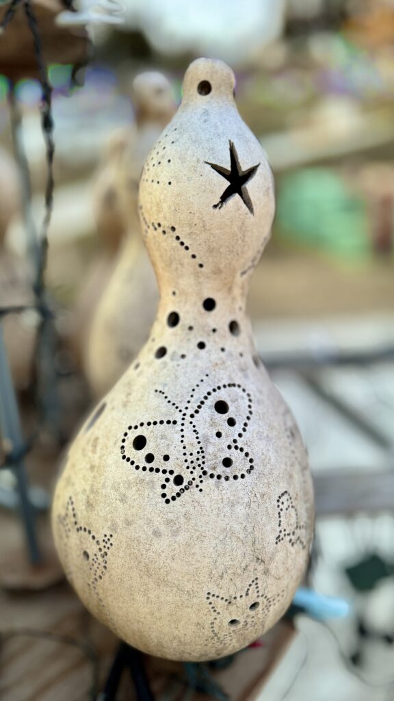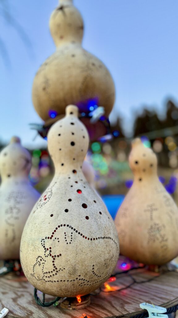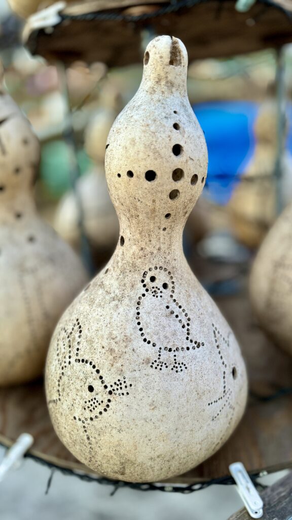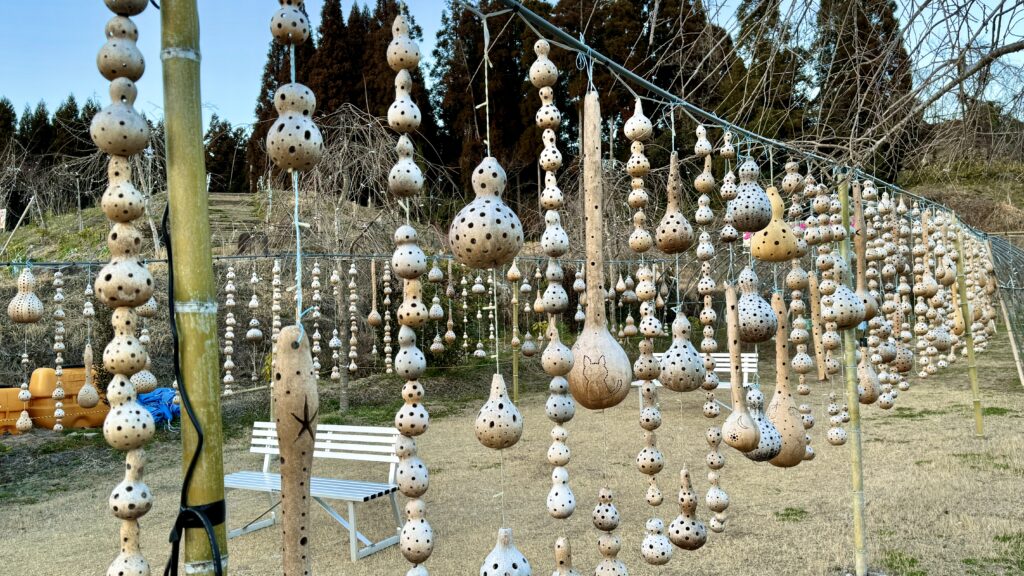 かわいい絵柄が彫り込まれたたくさんの瓢箪が飾られている。