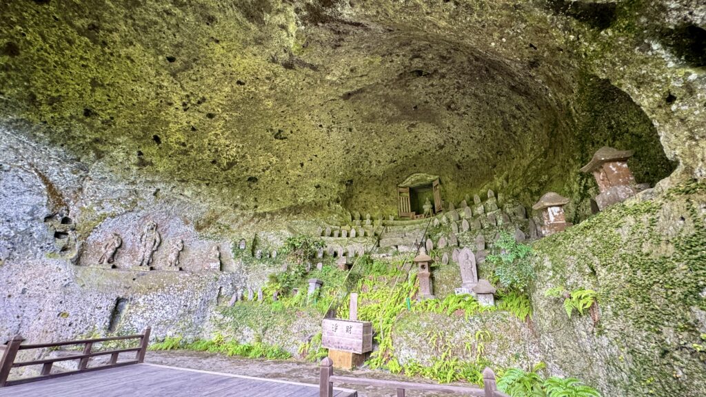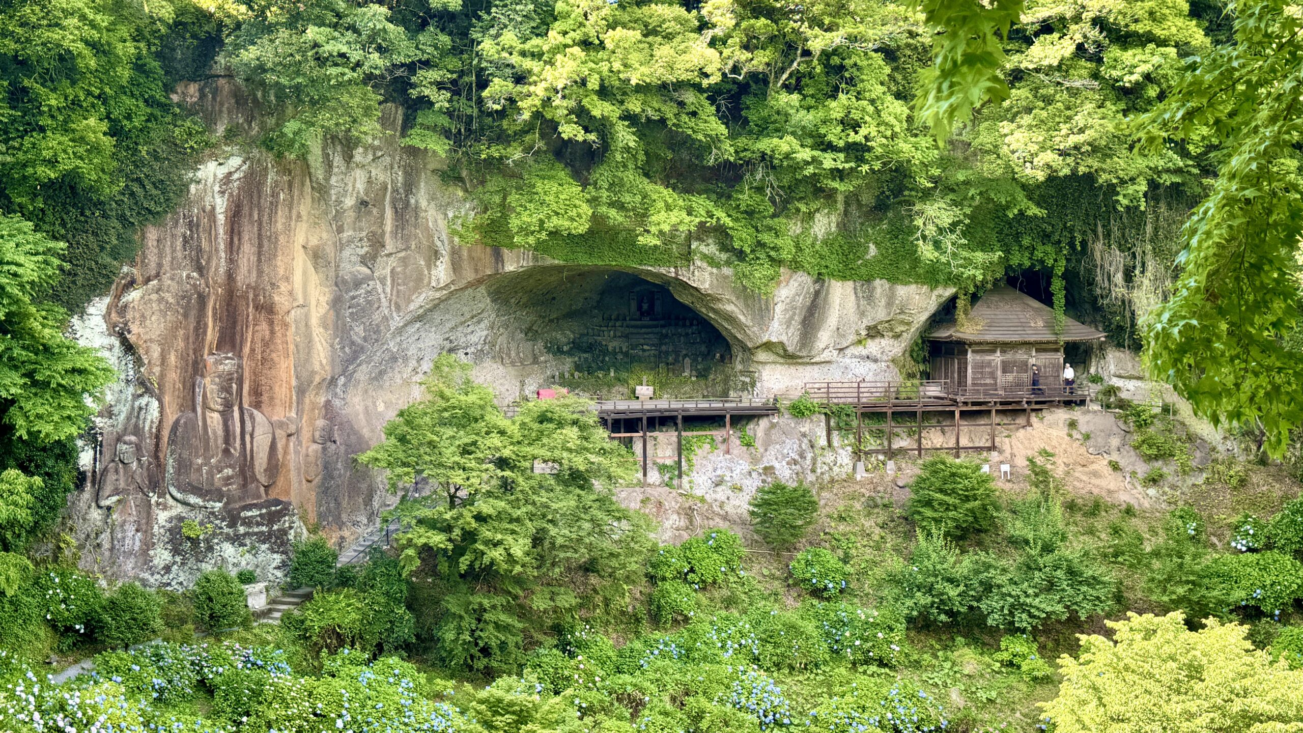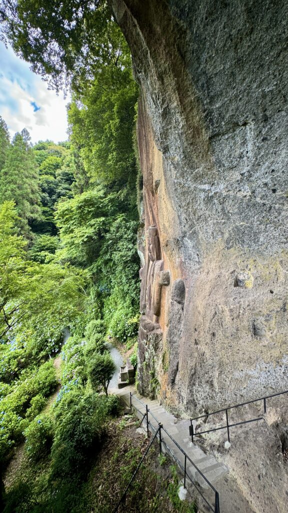 鎌倉時代の作と言われる国内最大級の不動明王とその奥の石窟の中にも摩崖仏と古い建屋がある。