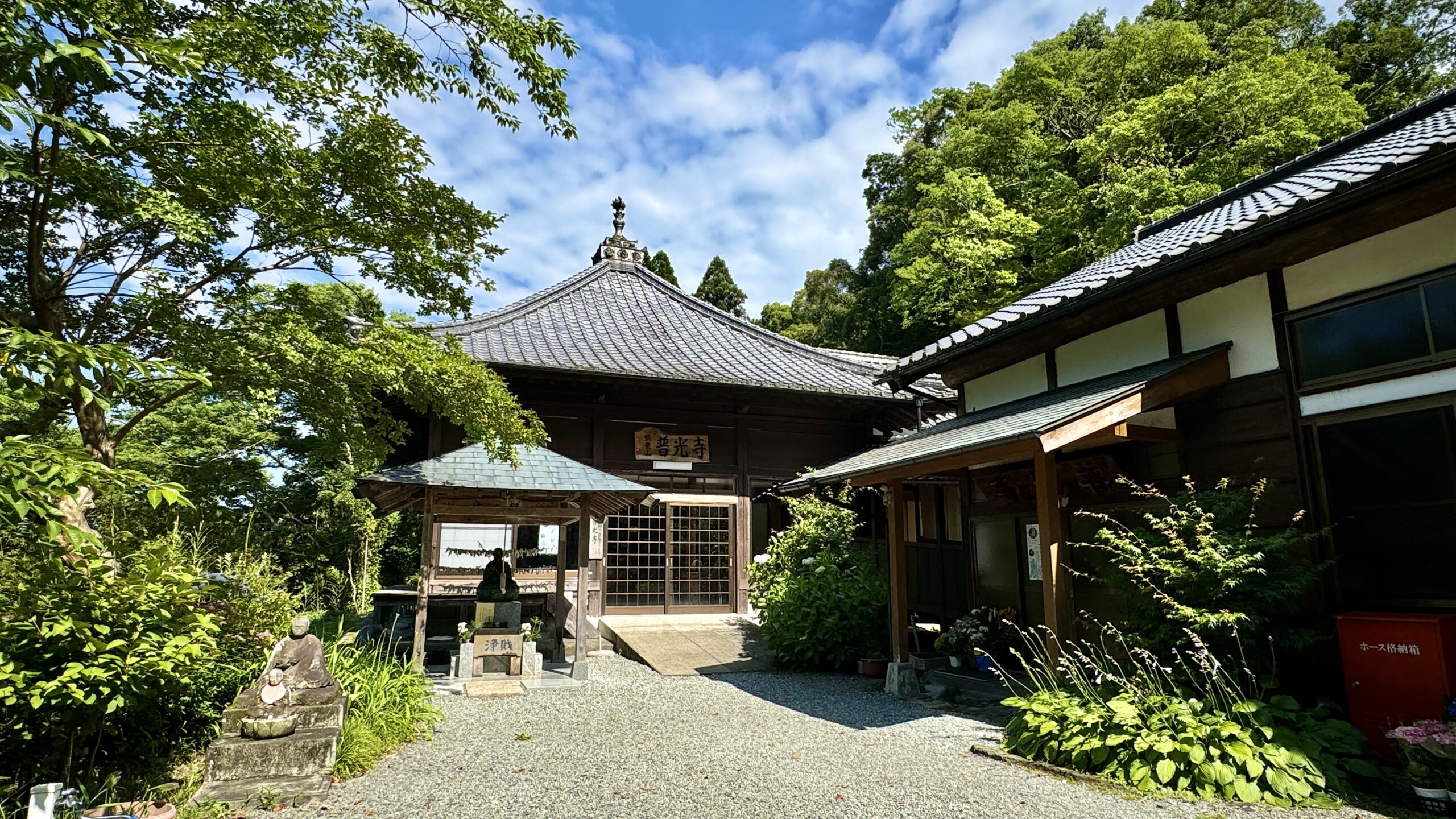 摩崖仏で有名なここ普光寺は別名アジサイ寺と呼ばれ、6月中旬ごろには敷地内いっぱいにアジサイが咲き訪問者を楽しませてくれる。