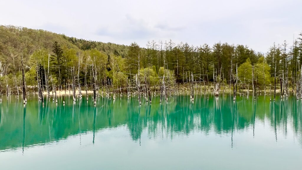 美瑛ブルーの池の中に立ち枯れた木々が並び幻想的な景色に見入ってしまう。