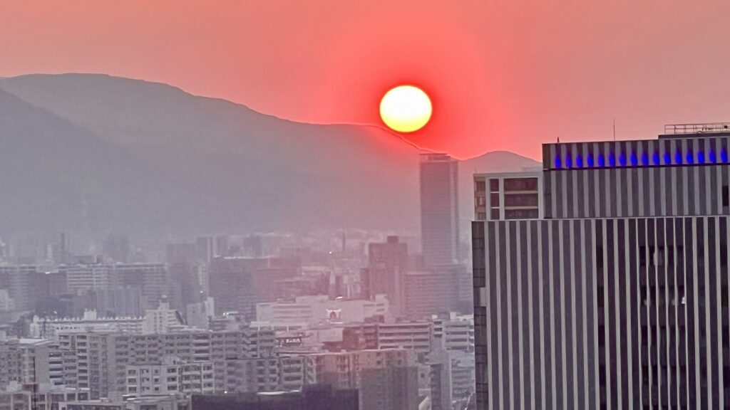 テレビ塔から夕焼けに染まる大道公園を見渡す。