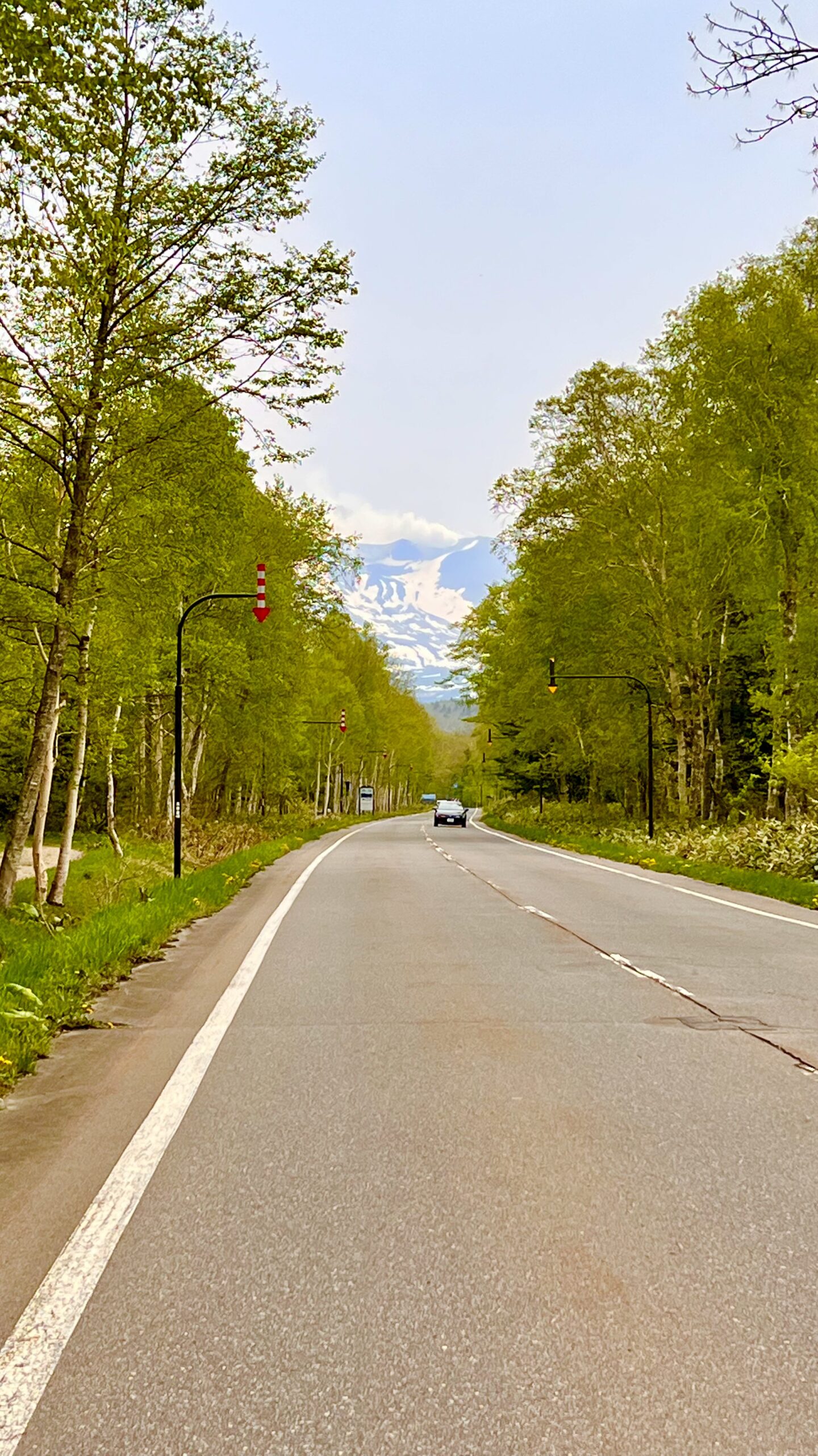 十勝岳に臨む白樺街道。ここを抜けて白金 青い池へ。