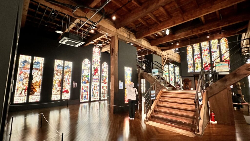 ステンドグラス美術館。入るなり鮮やかで迫力あるステンドガラスに圧倒される。